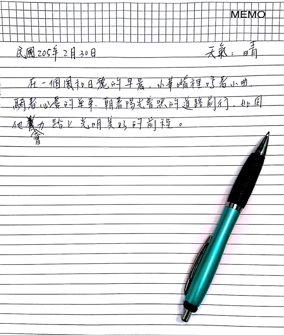 「在一個風和日麗的早晨,小華嘴裡哼著小曲,騎著心愛的單車,朝著陽光普照的道路前行,如同他奮力踏上光明美好的前程…」