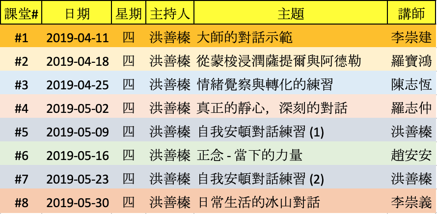 4月11日(四)起每週四晚上6:30pm ~ 9:30pm ,共計八堂課24小時