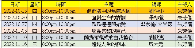 10/13(四)、10/20(四)、10/27(四)、11/3(四)、11/10(四)、11/16(三) 晚上8:00pm ~ 10:00pm ,共計六堂課12小時