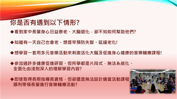 課程內容涵蓋了音樂、遊戲、認知、舞蹈、律動、肢體伸展、創作、歌唱、節奏訓練、身體打擊.樂器合奏………藉由學員與志工的互動、合作及刺激,來延緩身體老化與活化大腦的功能,開發出身體能量,預防失智,促進學員身體和心靈的健康,達到身心靈愉悅與平衡。