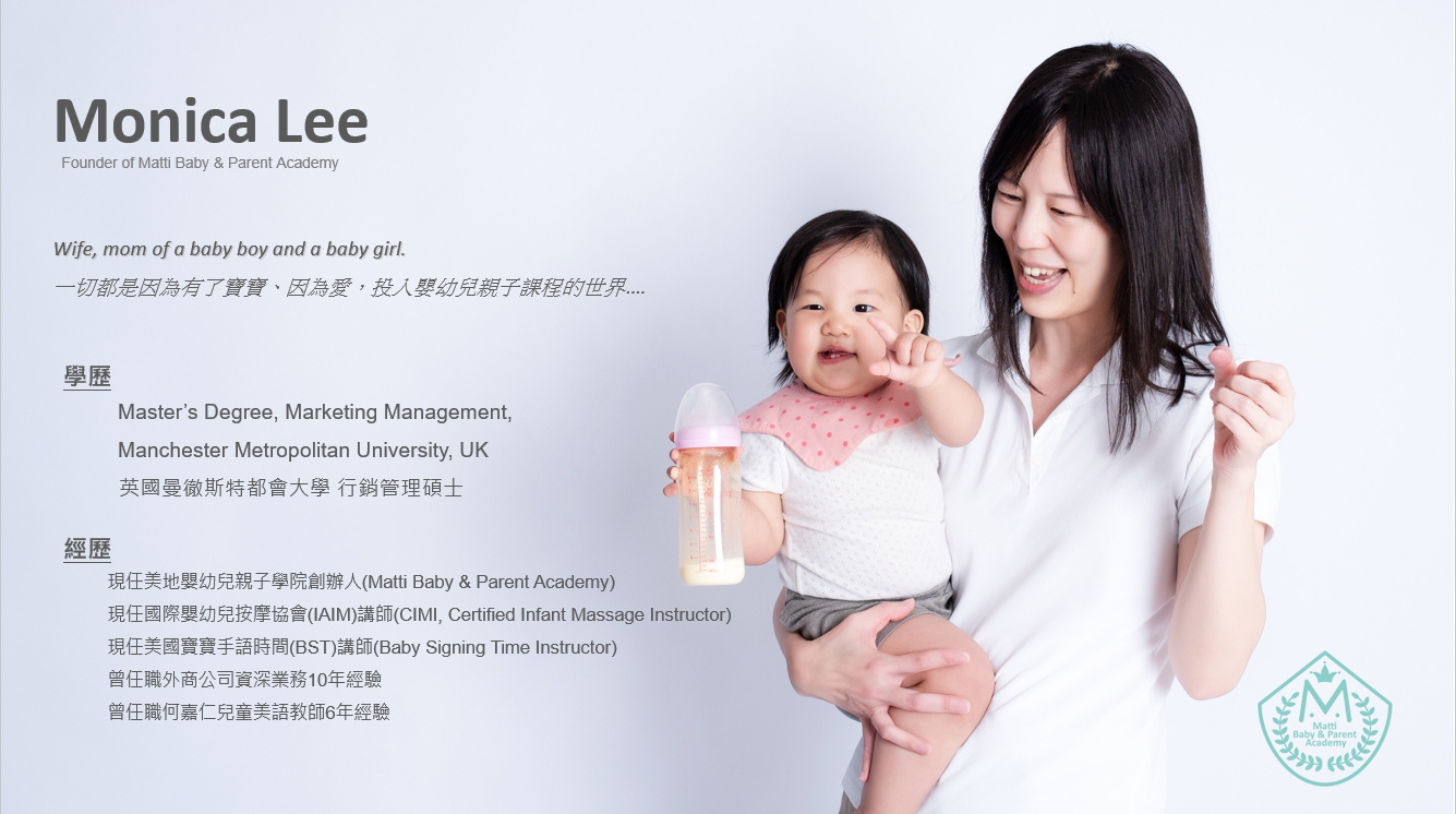 Monica老師原本在外商公司任職十餘年,結婚後陸續迎接二位小寶寶的到來,因為有了寶寶、因為愛,投入嬰幼兒親子課程的世界。