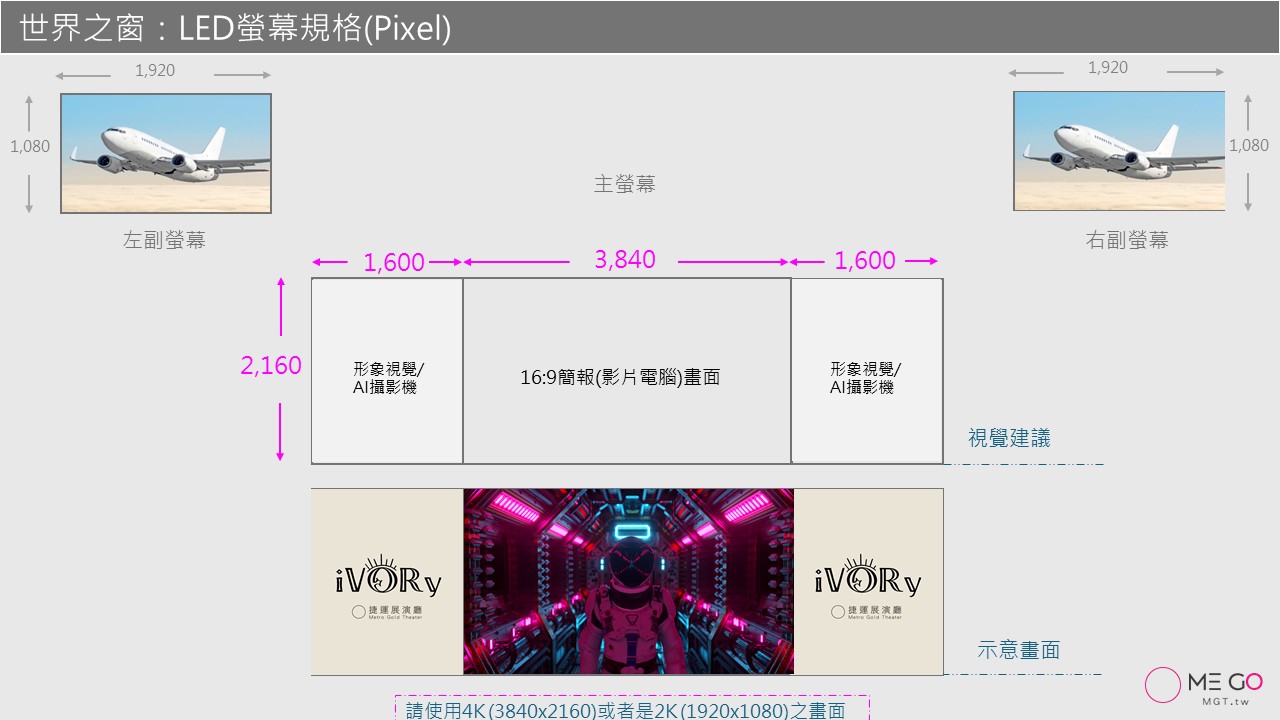 現場主螢幕尺寸為480吋 (寬10.56米 x 高3.24米),左右副螢幕為 130吋 (寬2.88米x高1.62米)