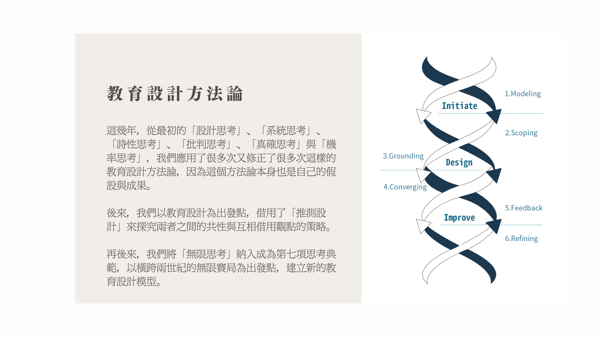 - 教育設計方法論,已經不再只有六種思考典範,而是在 2021 年首次加入無限思考,將心理學無限賽局理論納入,使教育設計更具有長期性的時間觀點。