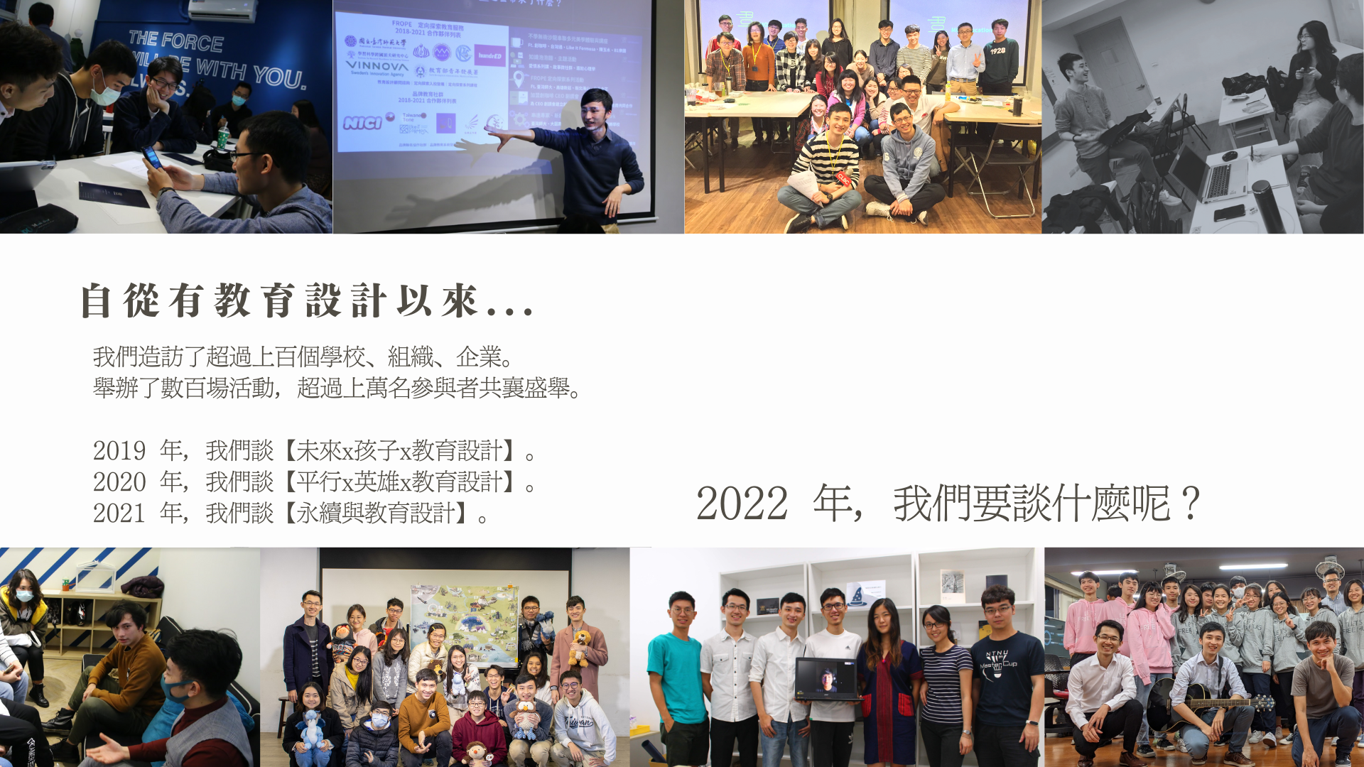 - 今天,教育設計作品已經橫跨十個國家、四十個合作單位、五百場活動、一萬五千人次參與。與 2020 年的數據比起來,影響力大約是成長了 5000% ,連我們自己都有些意外,雖然這其實都是努力與機遇共同的成果。