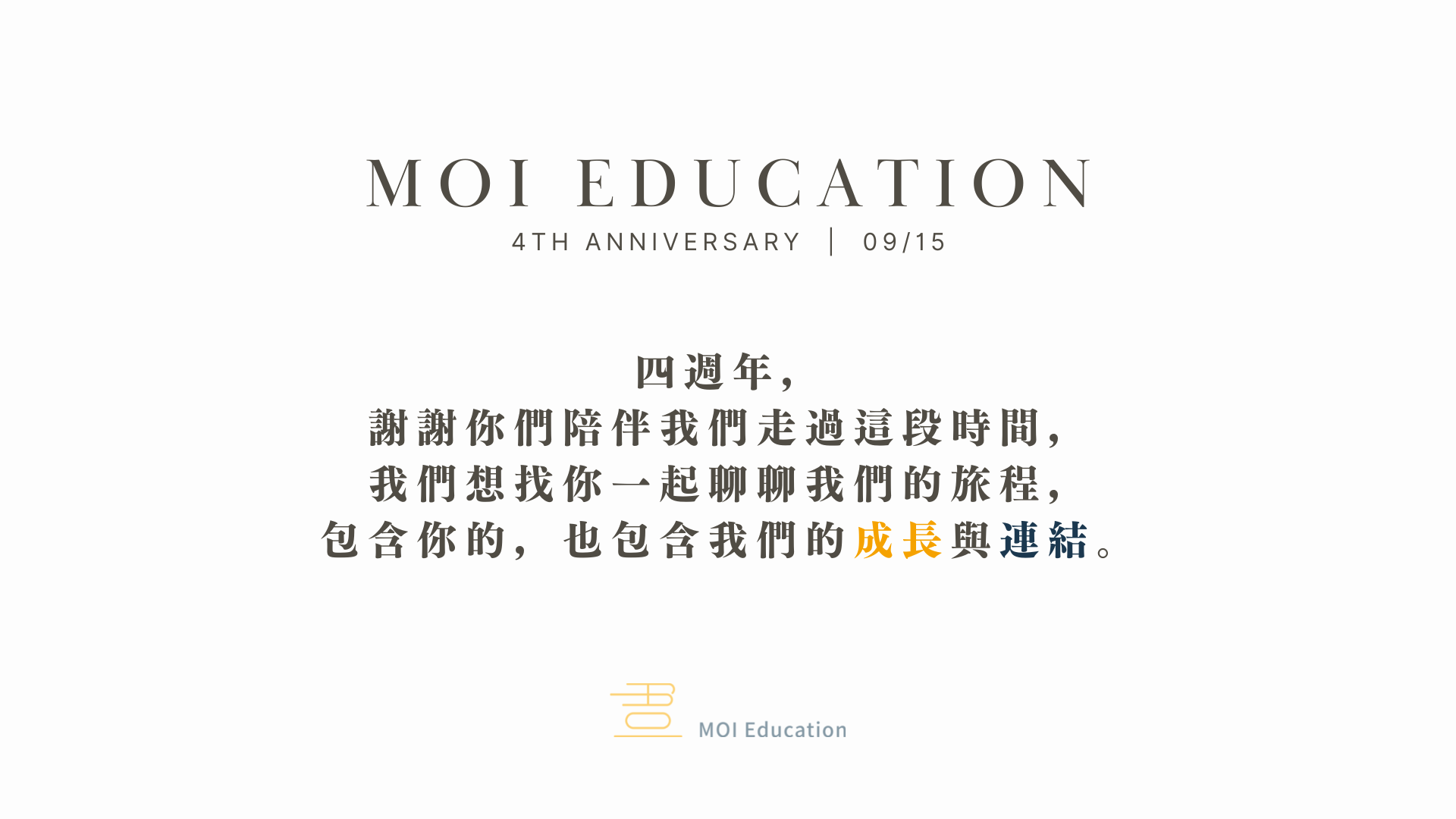 不變的是,MOI 還是秉持最一開始的初衷【永續學習者】的初心,從事每一件教育設計作品。四週年的今天,我們想邀請陪伴我們的你妳你妳你,一起見證我們四年的變與不變,用兩個詞彙來濃縮這四年的主題,我們選擇【成長】與【連結】。