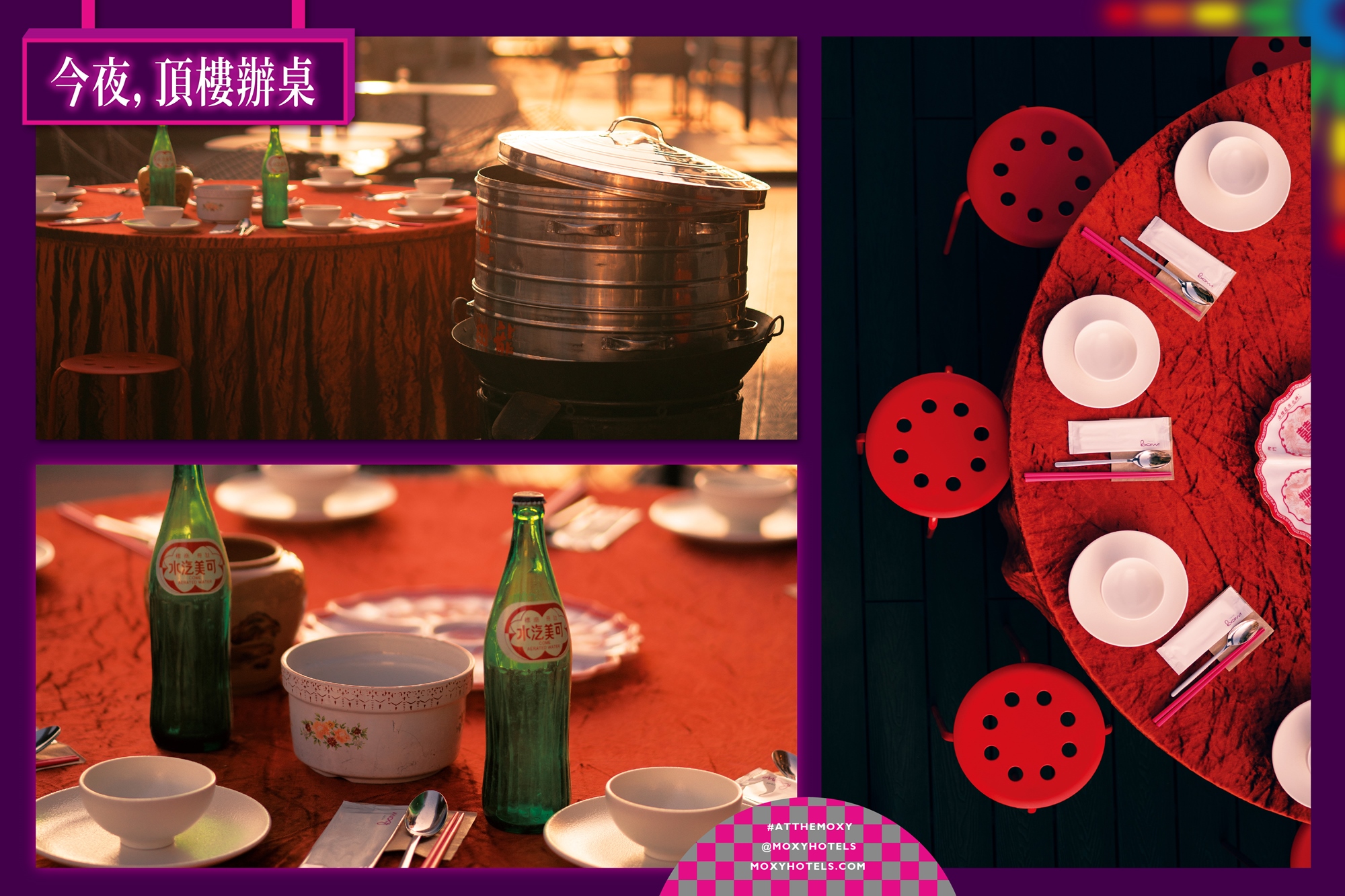 Moxy 2023年隆重鉅獻──「今夜,頂樓辦桌 MOXY ft. 金葉摸油湯」,邀請高雄內門傳承70年的辦桌品牌「金葉摸油湯」和Moxy一起帶來一場新潮又復古的台味辦桌派對。