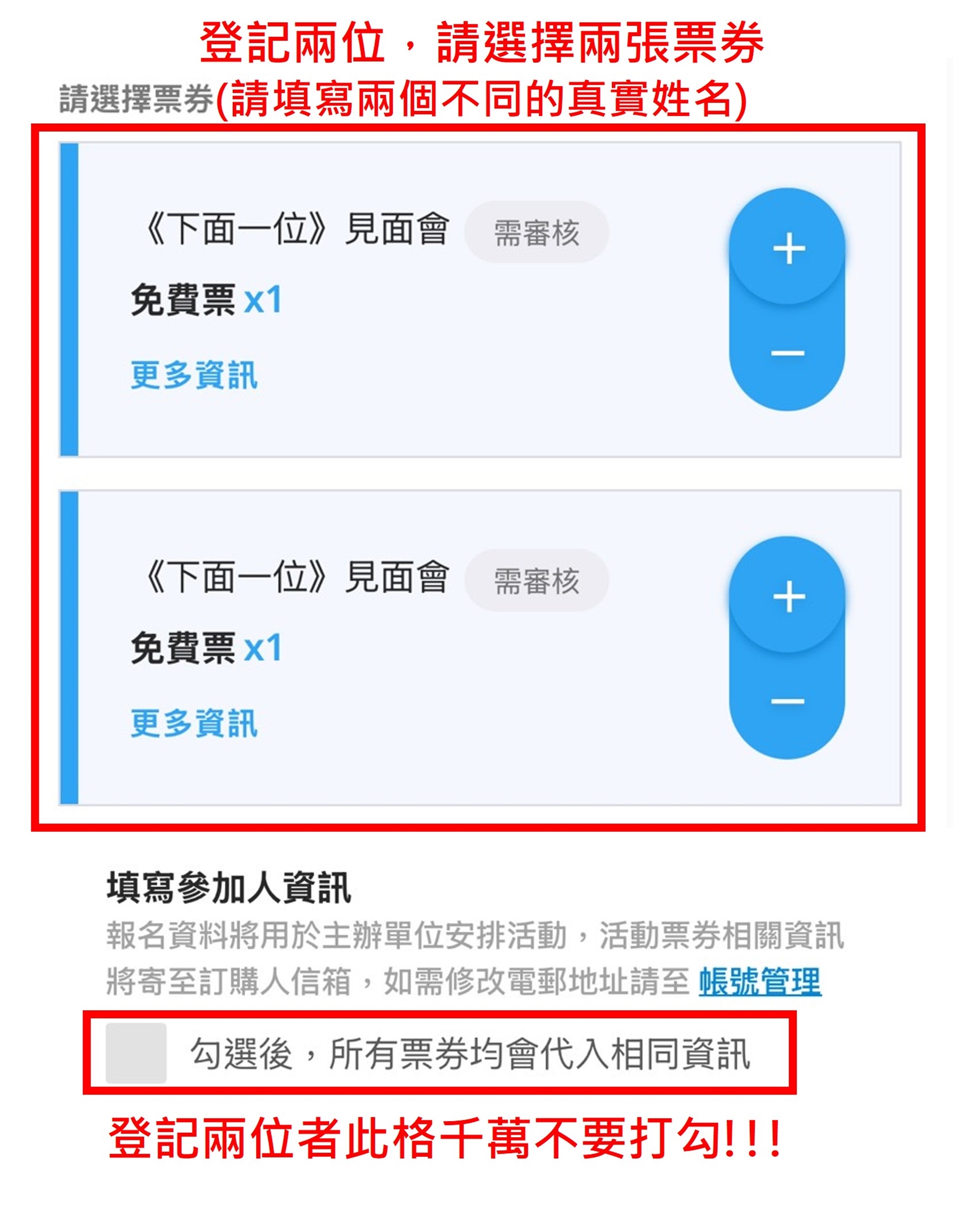 ⚠️一個帳號至多可登記兩位,請填寫真實姓名及資料