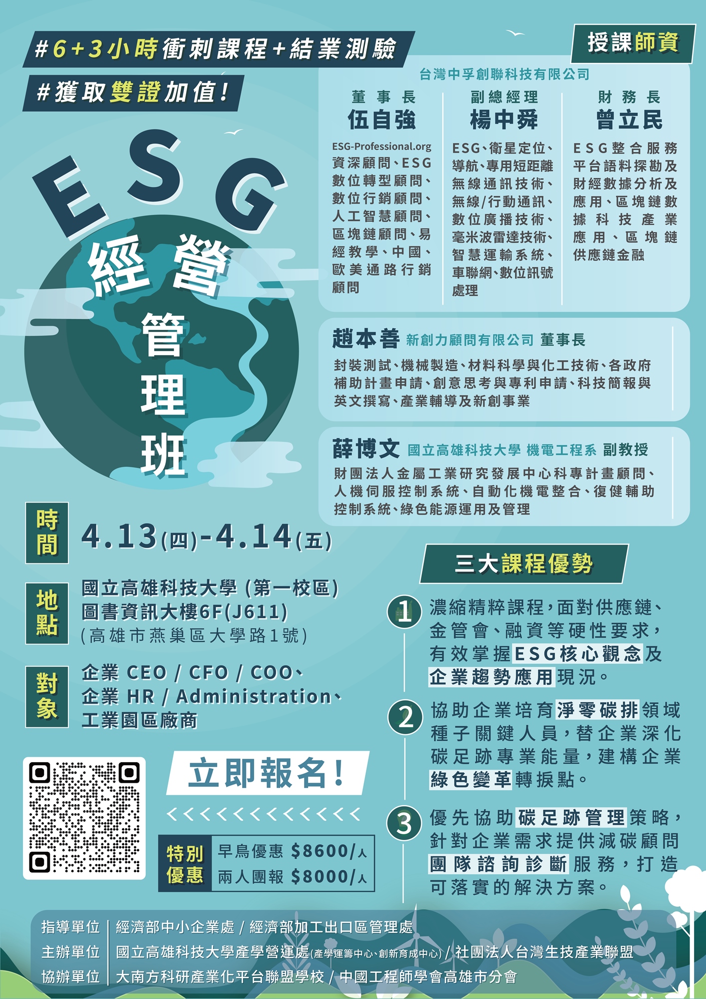 - 研習期滿,且考試成績合格者,將由 國立高雄科技大學 及 ESG Professional Org 發給培訓證書。