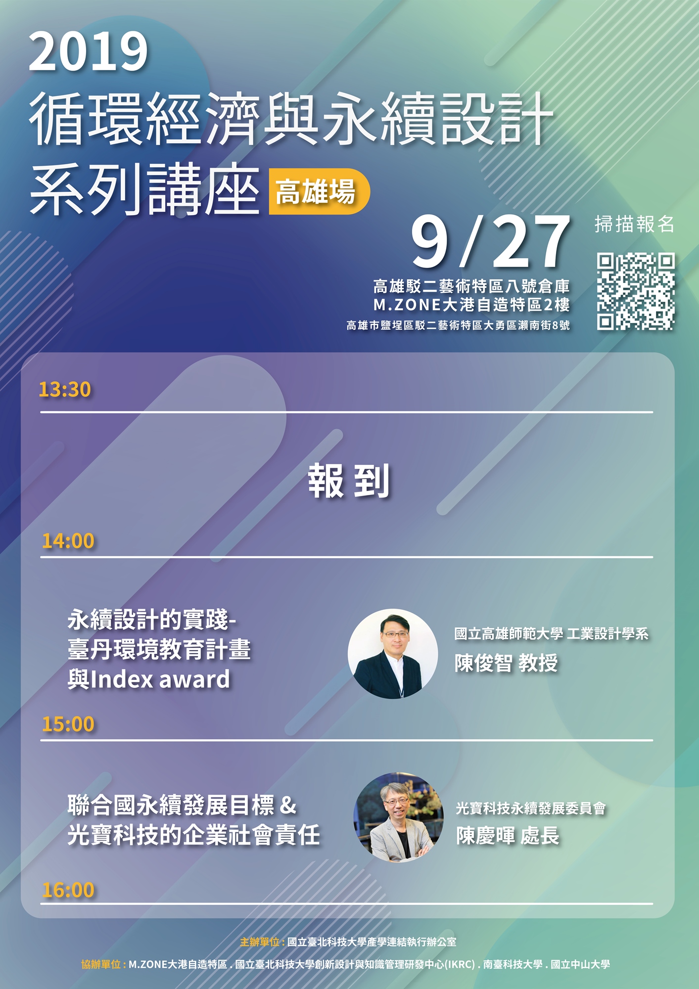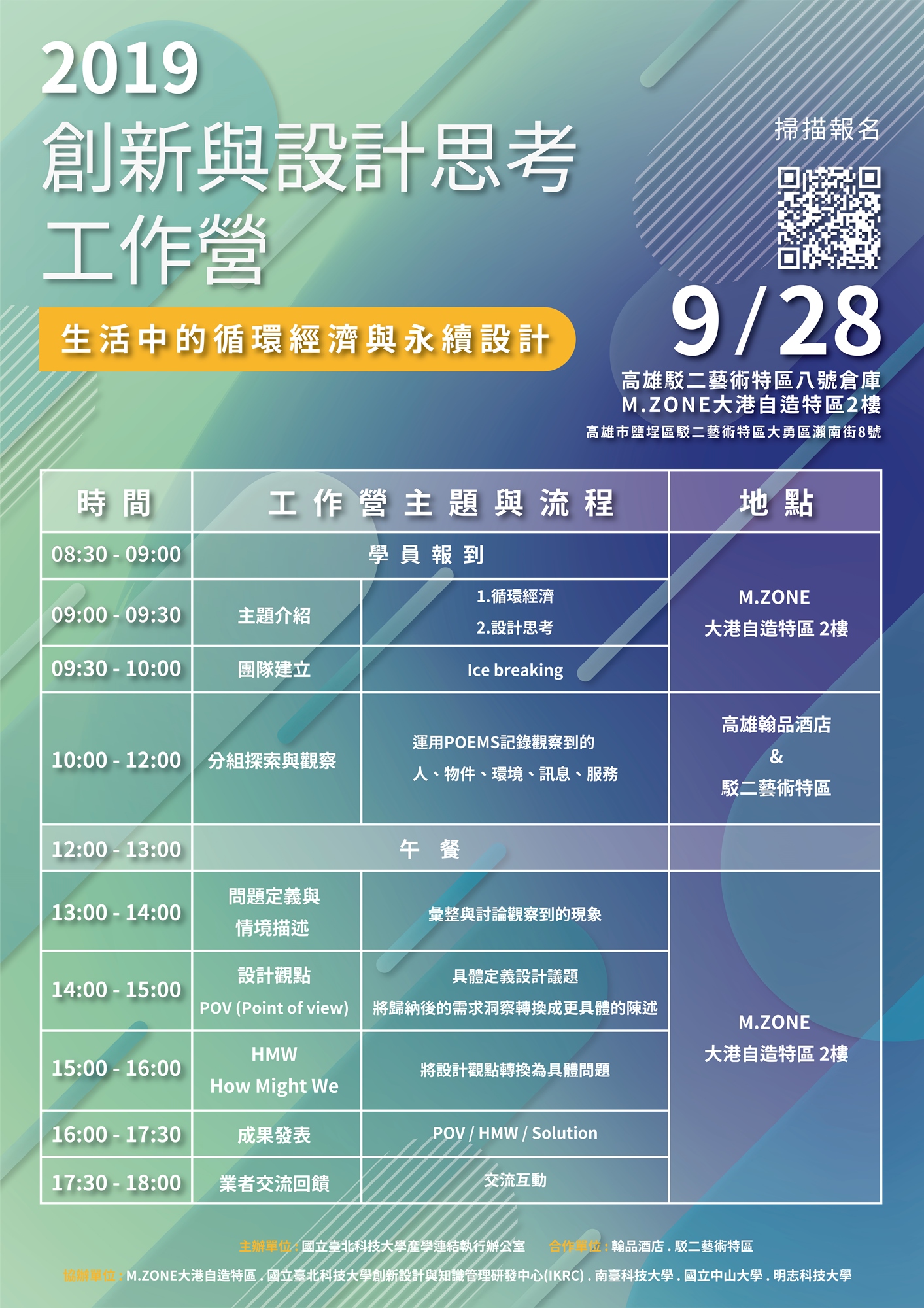 2. 9/27(五)循環經濟與永續設計系列講座恕無供餐;9/28(六)創新與設計思考工作營提供午餐