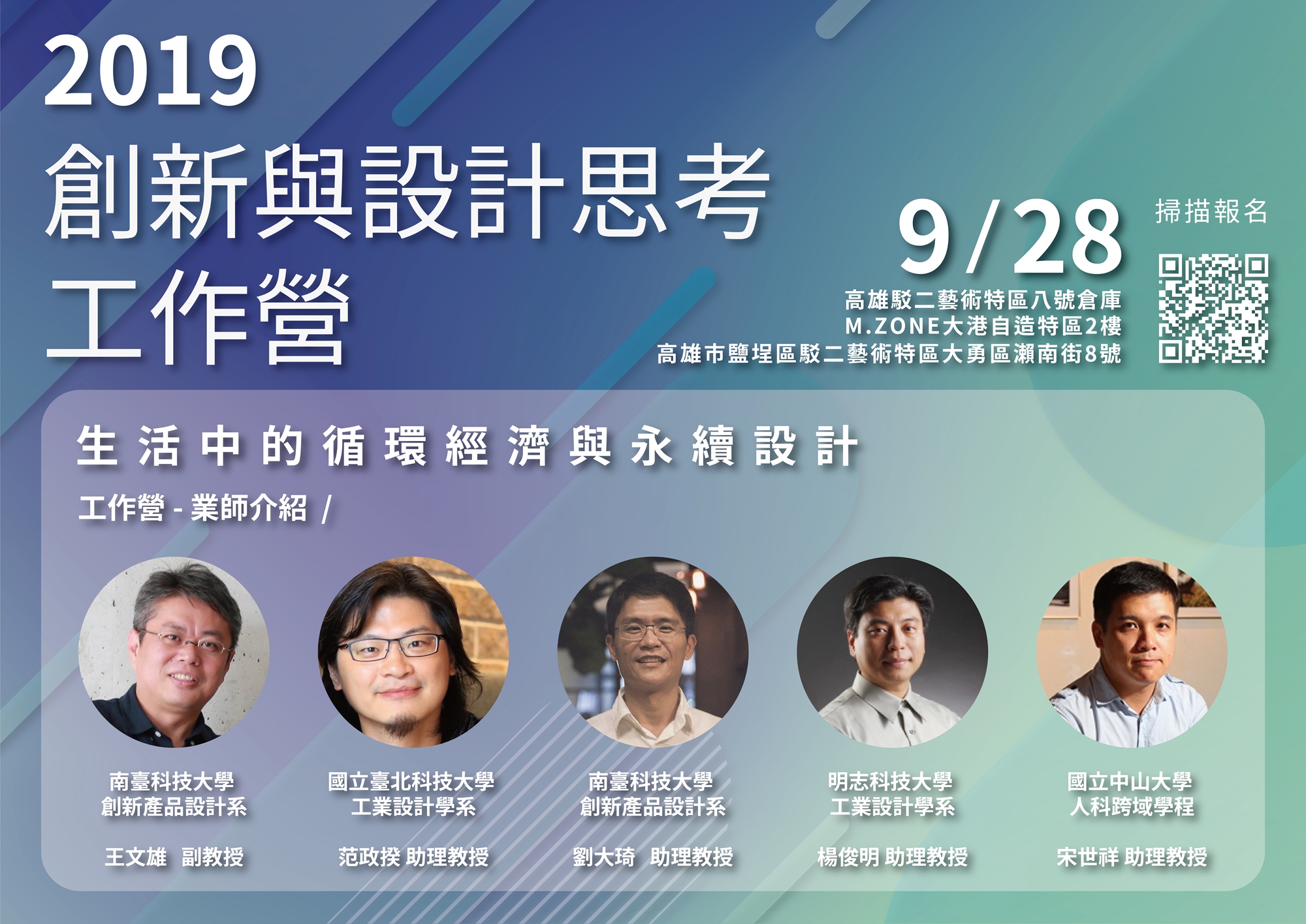 「設計思考」為跨領域人才所需具備的核心能力,此次在高雄辦理「創新與設計思考工作營」,為108年教育部促進產學連結合作育才平臺-文創設計工作圈的產學連結與人才培育活動,由臺北科技大學鏈結夥伴學校南台科技大學、中山大學、明志科技大學和企業夥伴M.Zone大港自造特區、翰品酒店、駁二藝術特區共同舉辦,透過產官學研共同的探討與交流,探索循環經濟與永續設計相關議題,並藉由設計思考的思維模式,帶領學生找出未來發展的可能性。M.Zone大港自造特區是由高雄市政府委託辦理,欲打造南台灣最專業的自造者空間,透過MakerSpace串接高雄在地社群與業者,進而鏈結國際社群與業者,帶動南區產業創新思維,為產業轉型掌握發展先機。