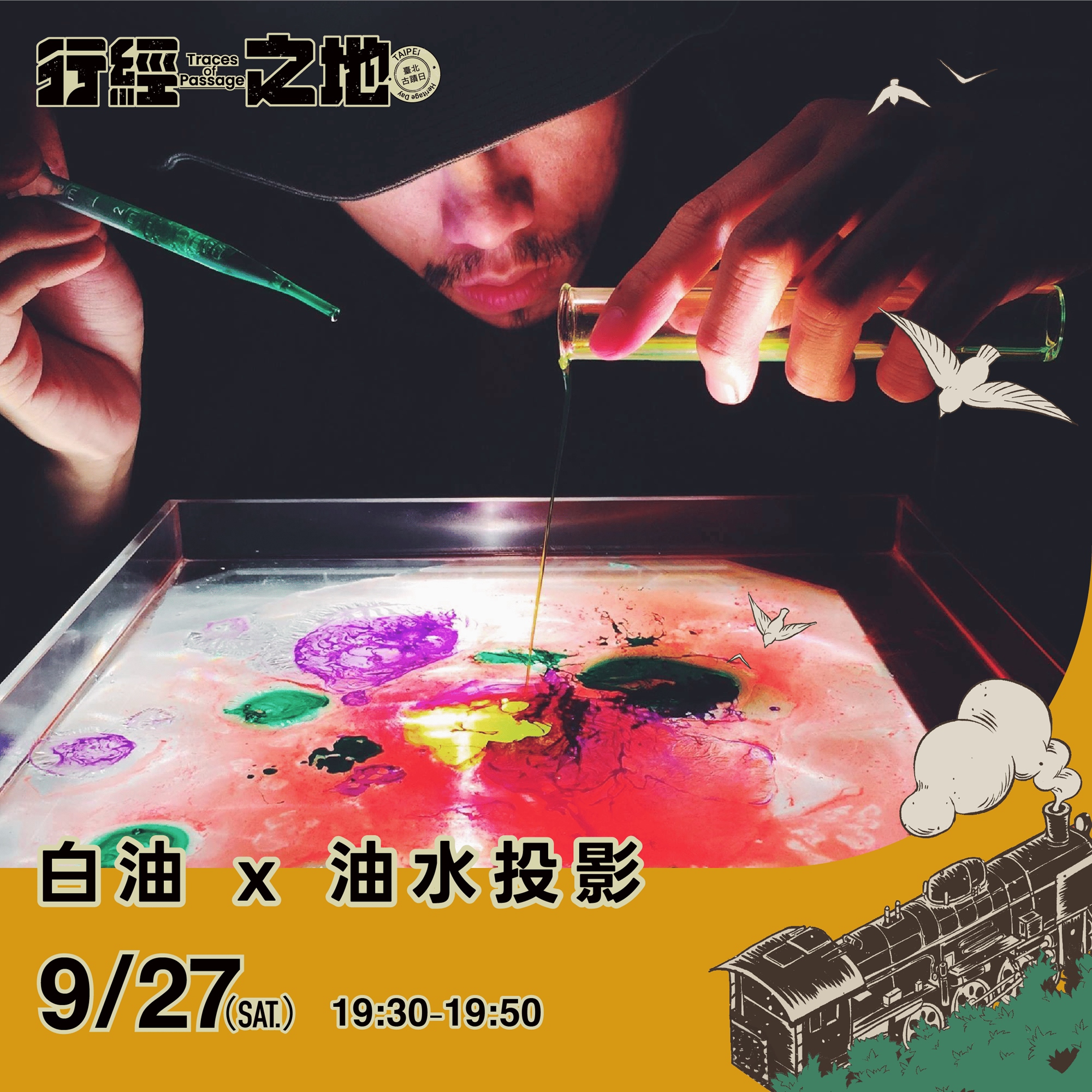 視覺藝術家白油將進行現地油水投影創作,透過流體光影與即興演出,結合牆體與液態光雕,凸顯出空間的歷史紋理與建築質地,將老建築轉化為動態光場。