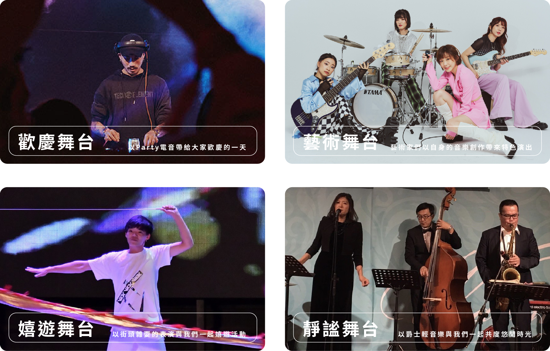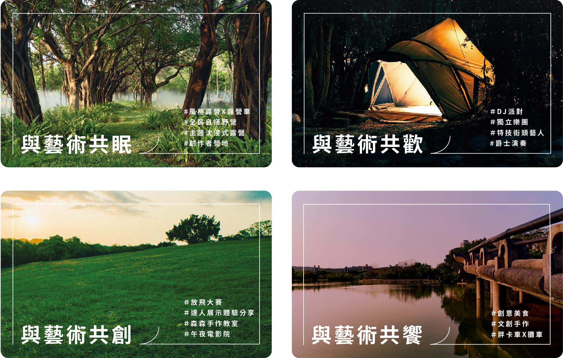 在美術館的草地林蔭中,讓藝術走進生活,園區中設置四大舞台 讓我們一起用美感帶來愉悅,透過身體力行來參與各種形態的藝術體驗。