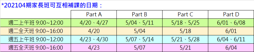*週二上午班 9:00~12:00:4/20, 4/27, 5/04, 5/11, 5/18, 5/25, 6/01, 6/08. 共24小時。