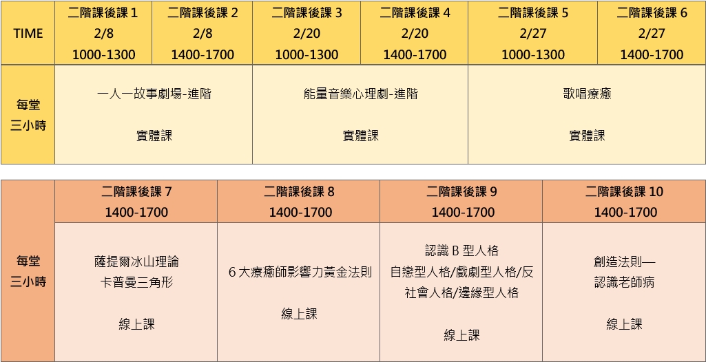 2.第二階段課程:每堂3小時、18小時實體課+12小時線上課,總計30小時。