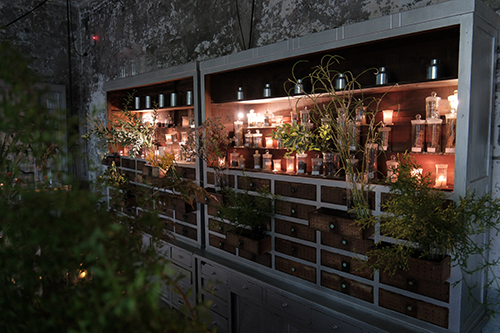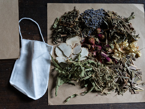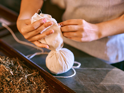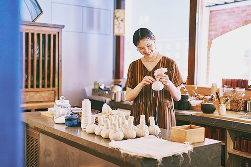 百草櫃與掌櫃桌之間盈滿藥香氛圍,經歷歲月時光的洗禮與沉澱,伴隨著掌櫃的聲音,帶領大家製作天然漢方—紓緩草本按摩球乙份。