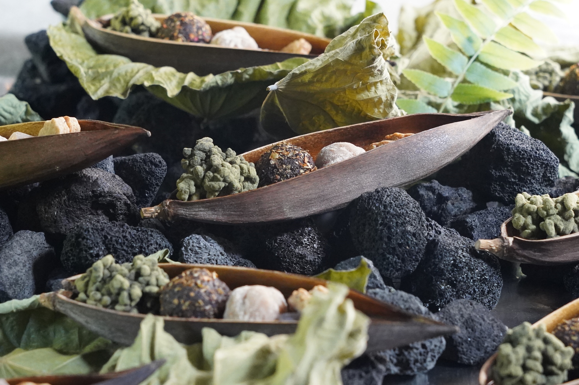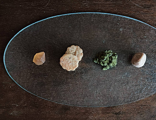 「礦食點心組」以純植物為基底的手工點心組佐一杯飲品。內含紅烏龍琥珀糖、刺蔥堅果脆餅、香草米巧克力、米麩橙花豆沙、香料裸食能量球,繁複工序純手工製作,滿滿的能量補充作為旅程豐收結尾。