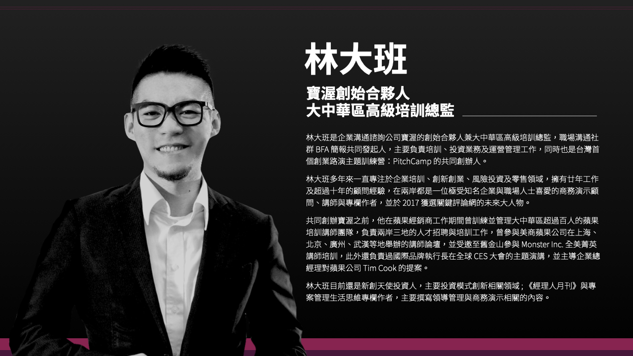 林大班是企業溝通諮詢公司寶渥的創始合夥人兼大中華區高級培訓總監,職場溝通社群 BFA 簡報共同發起人,主要負責培訓、投資業務及運營管理工作,同時也是台灣首個創業路演主題訓練營:PitchCamp 的共同創辦人。