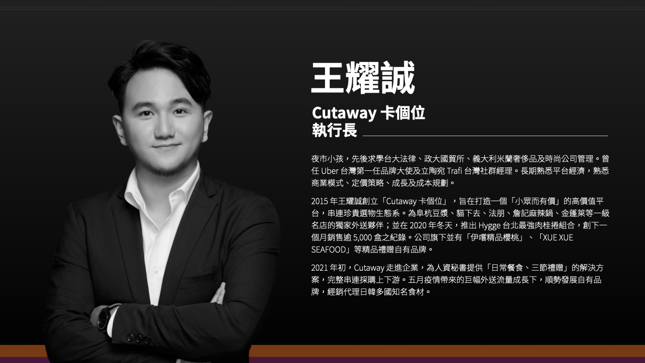 2021 年初,Cutaway 走進企業,為人資秘書提供「日常餐食、三節禮贈」的解決方案,完整串連採購上下游。五月疫情帶來的巨幅外送流量成長下,順勢發展自有品牌,經銷代理日韓多國知名食材。