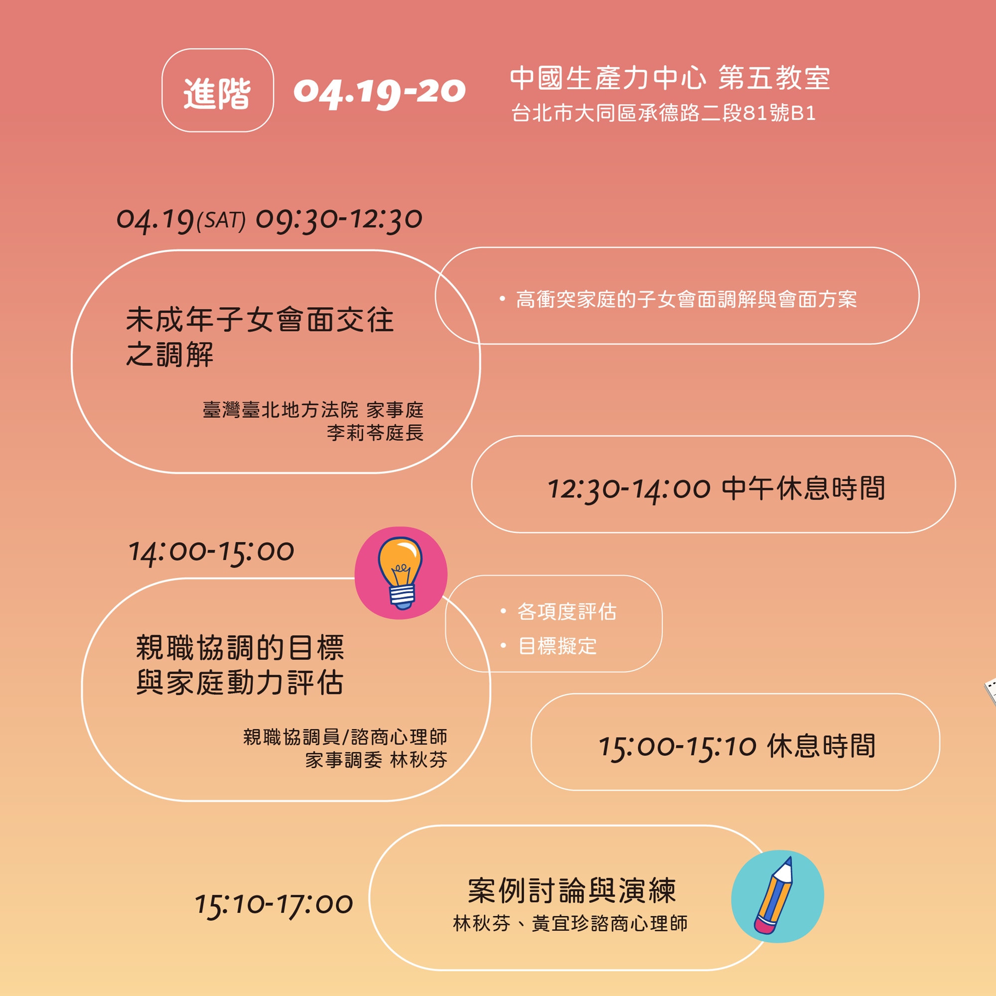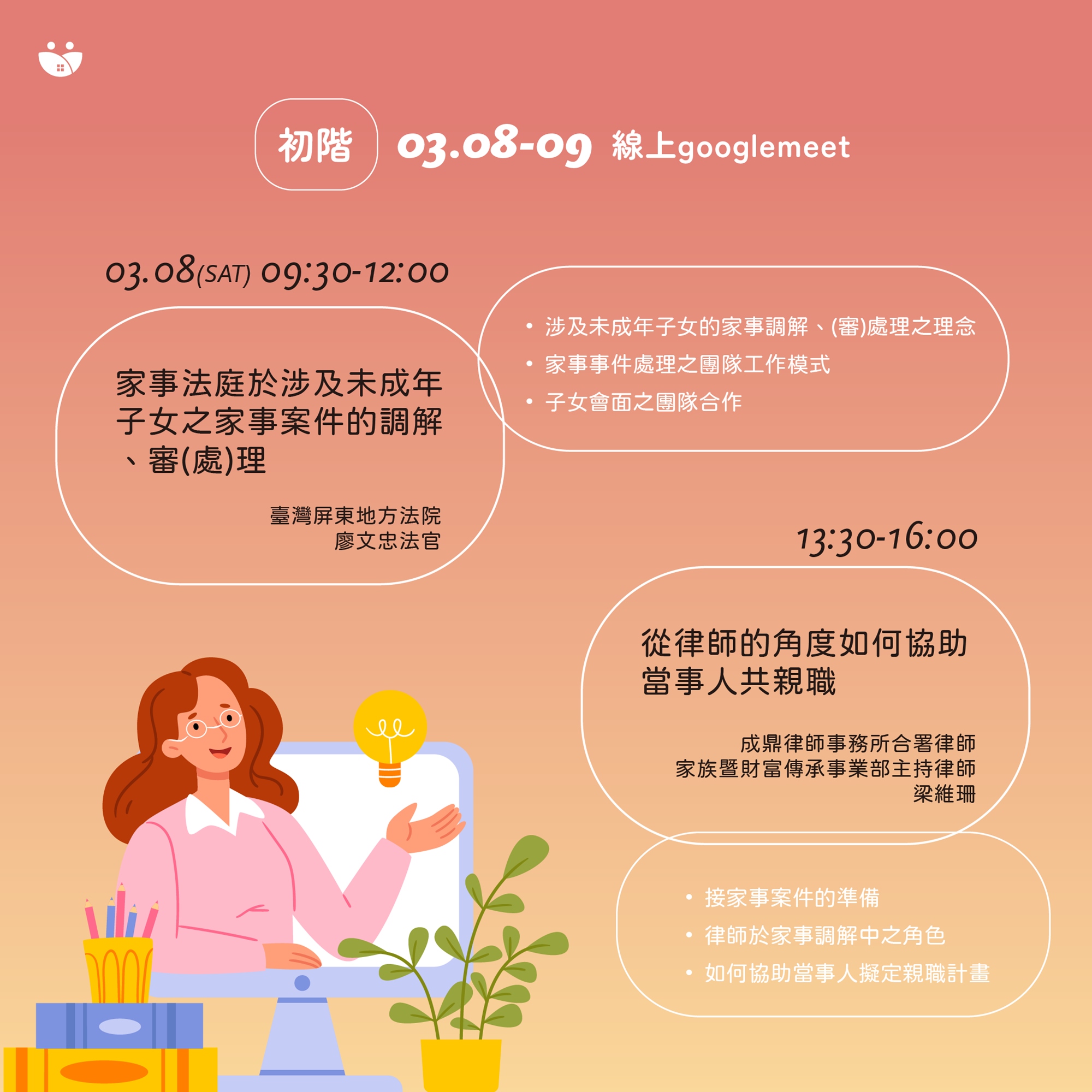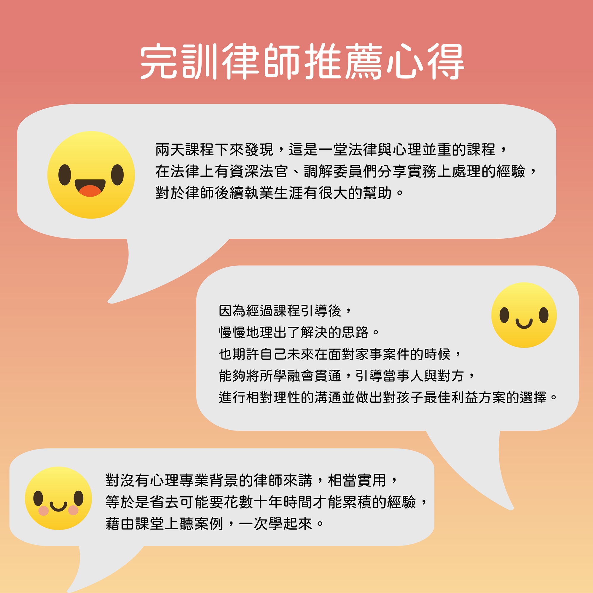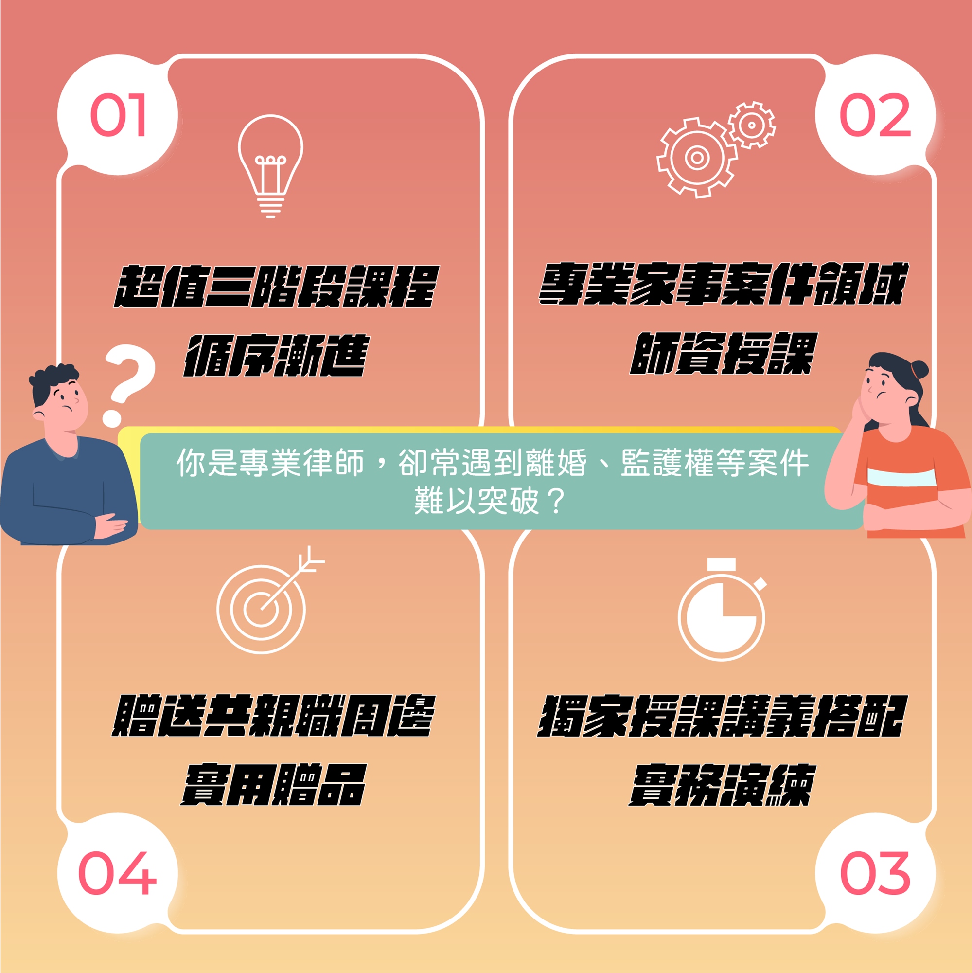 2025 年,我們將繼續辦理第六屆「律師專班—親職協調訓練系列課程」,課程內容精心設計,涵蓋初階線上課程、進階及高階實體工作坊,透過實務案例演練,協助律師在處理離婚、親權爭議、會面安排等家事案件時,以未成年子女的福祉為核心,制定更完善的解決方案。