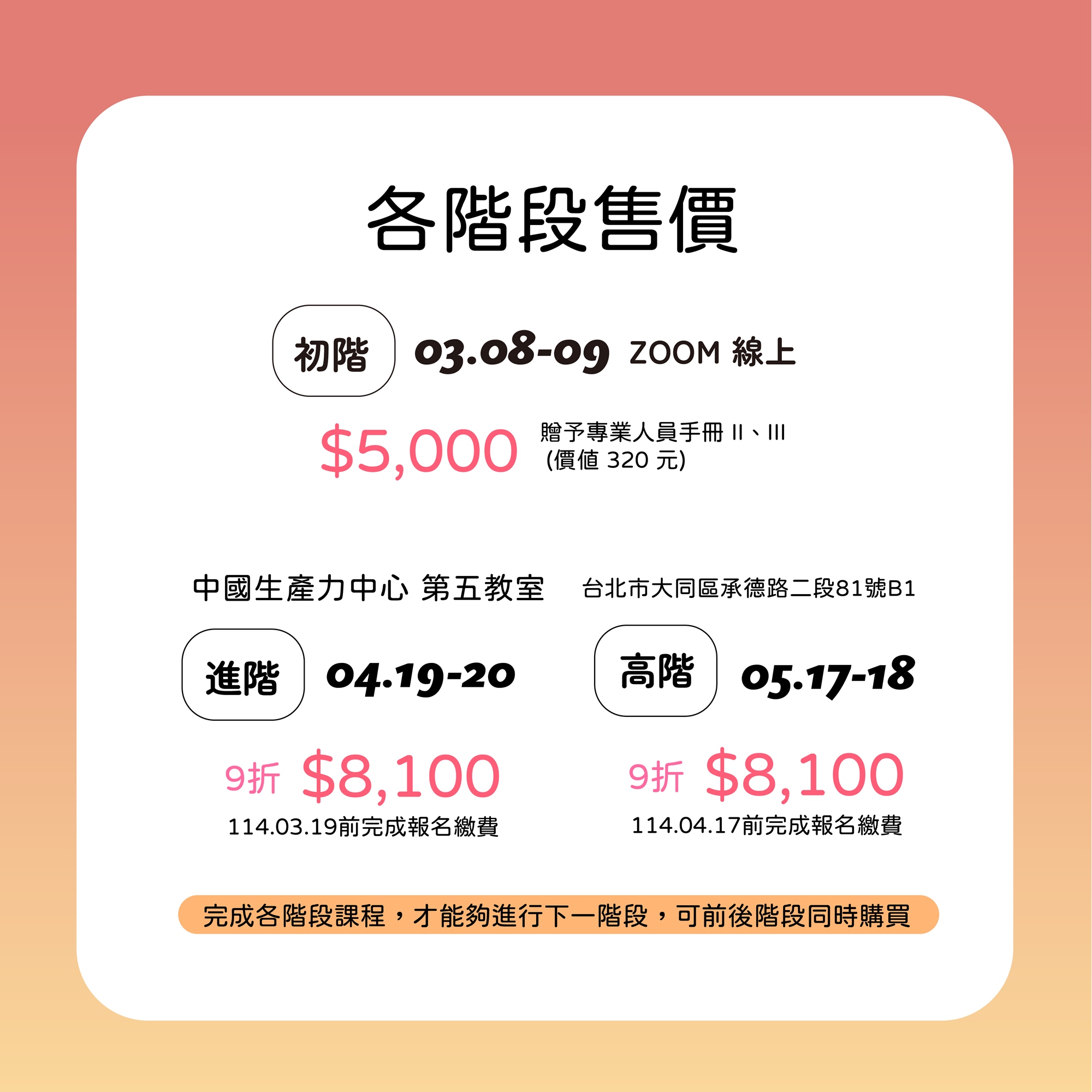 - 報名初階課程者贈予專業人員手冊 II、III (價值 320 元)。