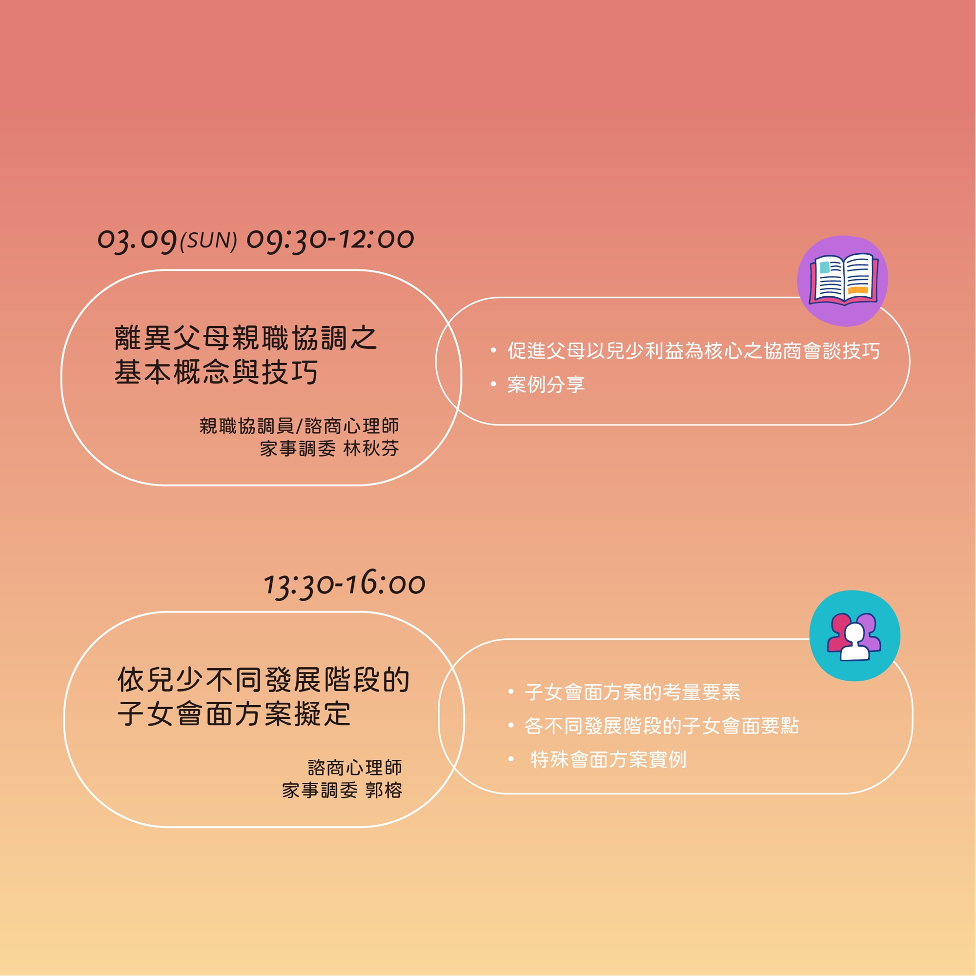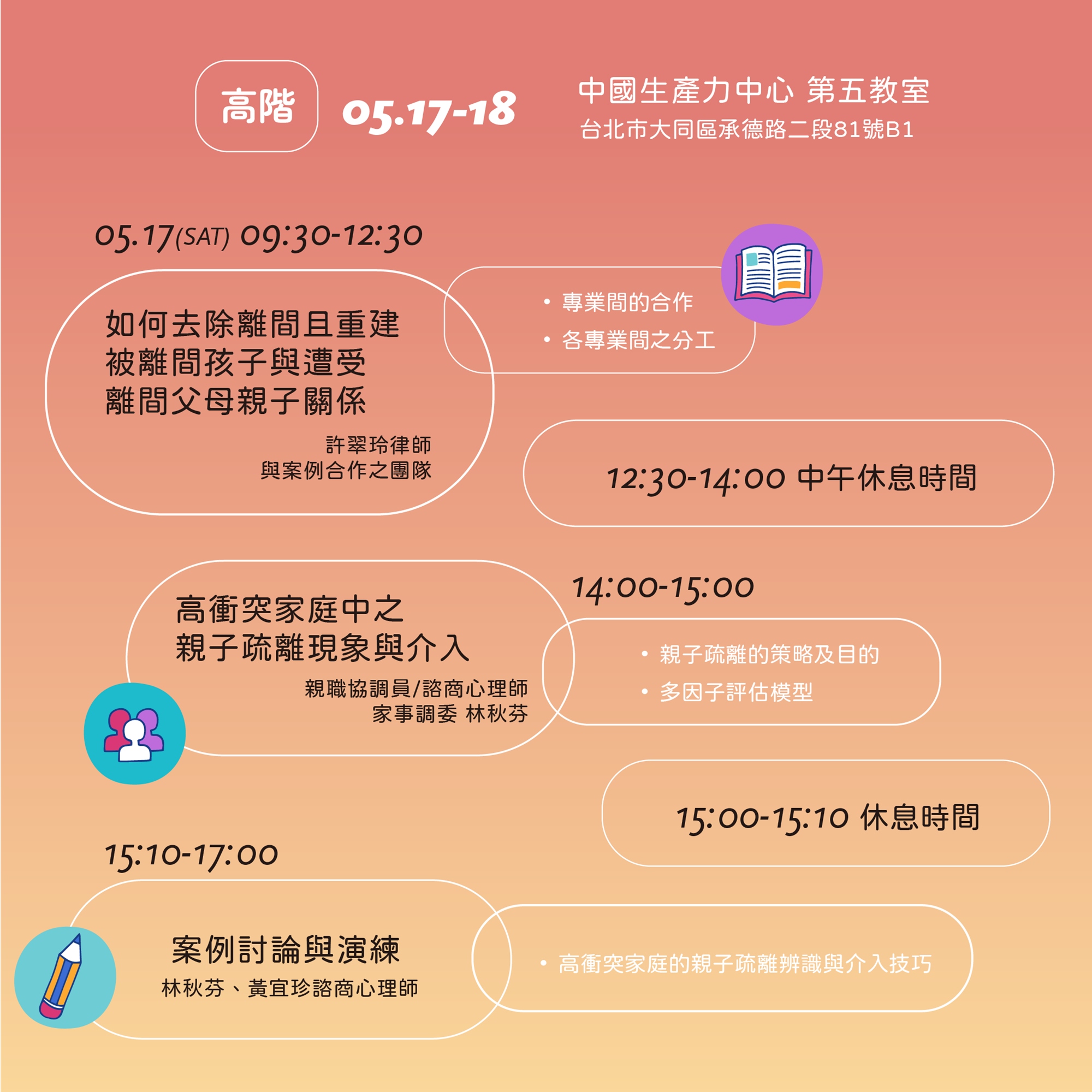 - 報名高階工作坊者於課程當日贈予「關於離婚,你必須知道的事:諮商心理師和家事法專家給的處方箋」、童心同行手冊 I、II、III、IV、繪本 5 本、環保袋(價值 2250 元)