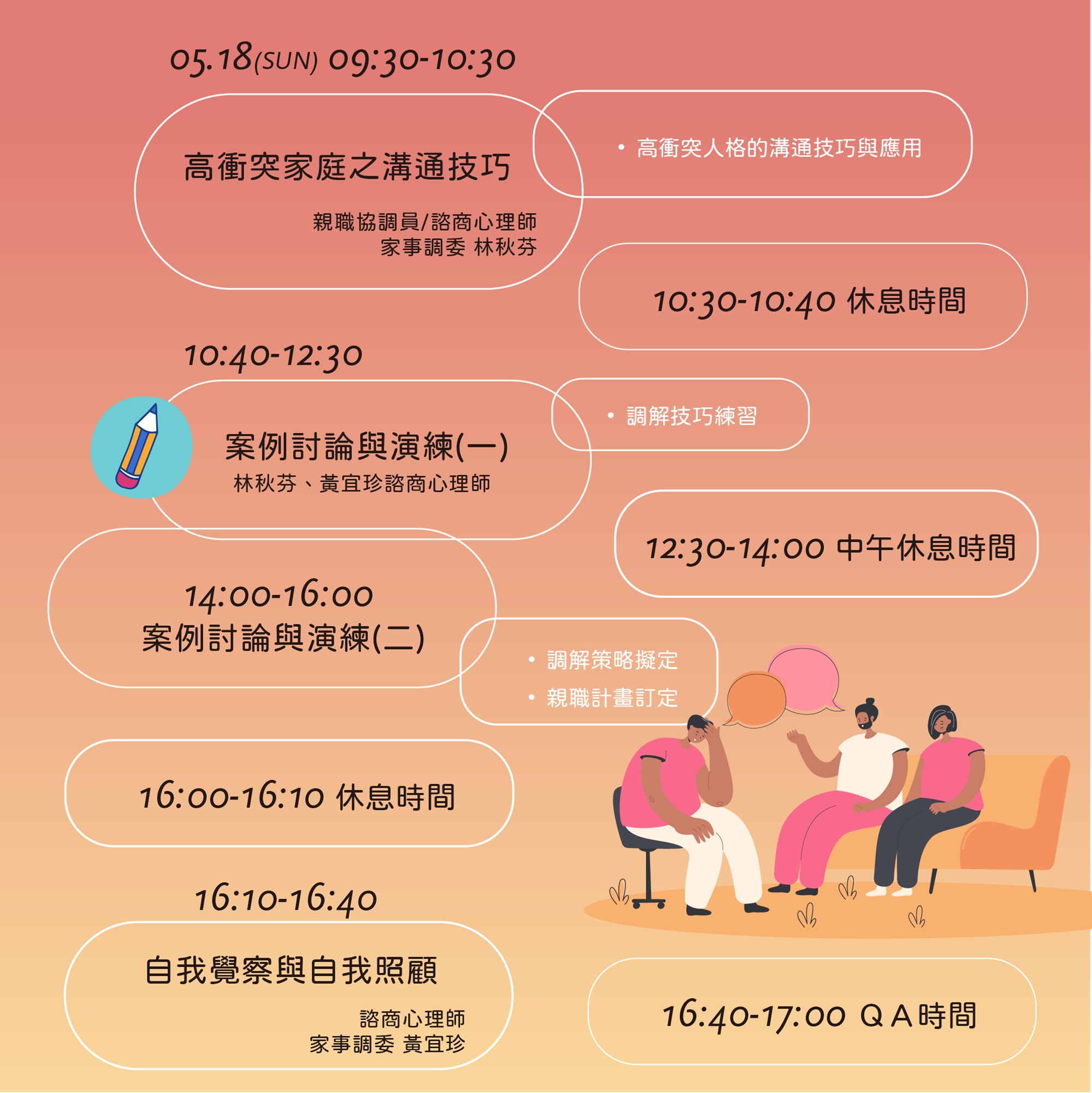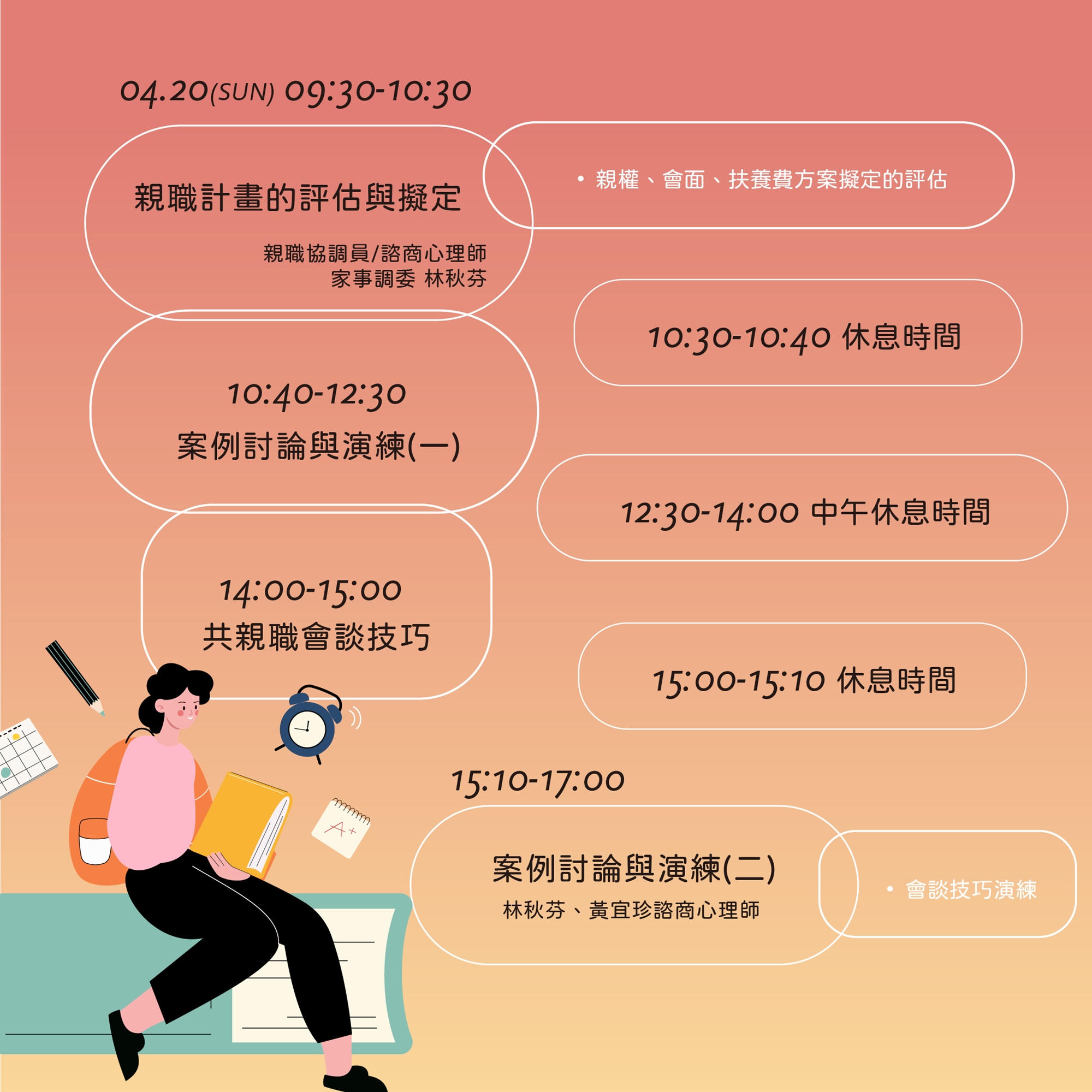 本課程由資深心理師林秋芬策劃主講,並邀請兩位家事法官與兩位律師擔任專題講師,花蓮兒家專業團隊帶領工作坊的案例實作演練,期使參訓者能夠學以致用,掌握親職協調的核心技能。