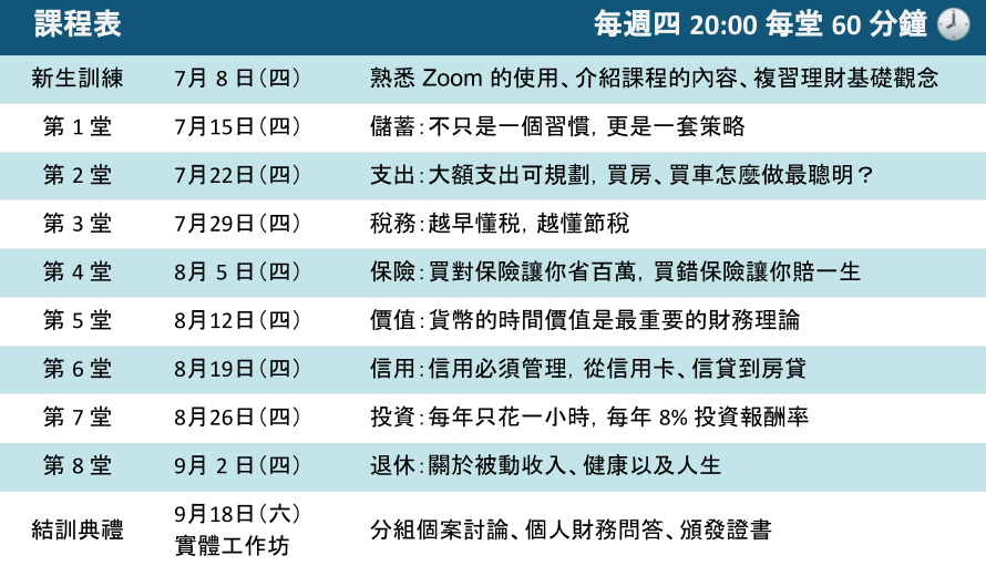 - 正式課程時間:7/8(四)~ 9/2(四) 20:00 - 21:00