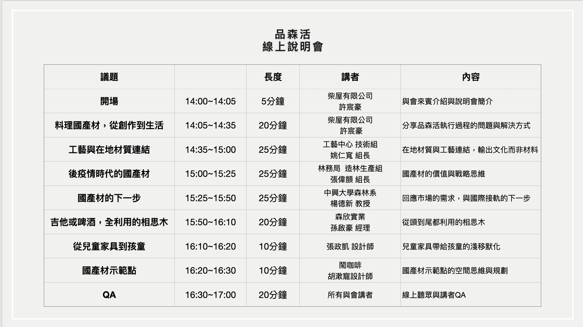 此次「品森活」說明會,由林務局和國立臺灣工藝研究發展中心跨部會合辦、文化部及行政院農業委員會林指導,將於8/23(一)舉辦線上說明會。國立臺灣工藝研究發展中心技術組組長姚仁寬、林務局造林生產組長張偉顗、專家楊德新教授、執行單位柴屋有限公司負責人許宸豪、品森活計師張政凱、國產材廠商森新實業與示範點鬧咖啡胡漱寵共同出席,探討目前國產材的現況與後疫情時代的國產材發展: