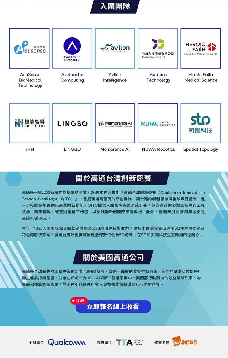 10:10– 11:00 | 第三屆「高通台灣創新競賽」入圍團隊產品展演暨簡報 Public pitch by 10 shortlisted teams of QITC 2021 |