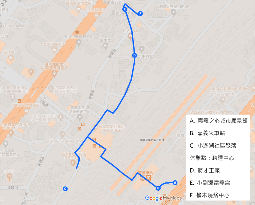 嘉義之心城市願景館【集合點】→ 嘉義車站 → 嘉義轉運站 → 進入小澎湖社區聚落 → 小澎湖機務段 → 糖鐵朴子線遺跡 → 嘉義轉運站(中途休憩點) → 竹文街 → 台糖北港線遺跡 → 將才工場 → 小副瀨富義宮(日本王爺廟) → 小副瀨聚落 → 檜木燒烙中心(休憩點2) → 回程