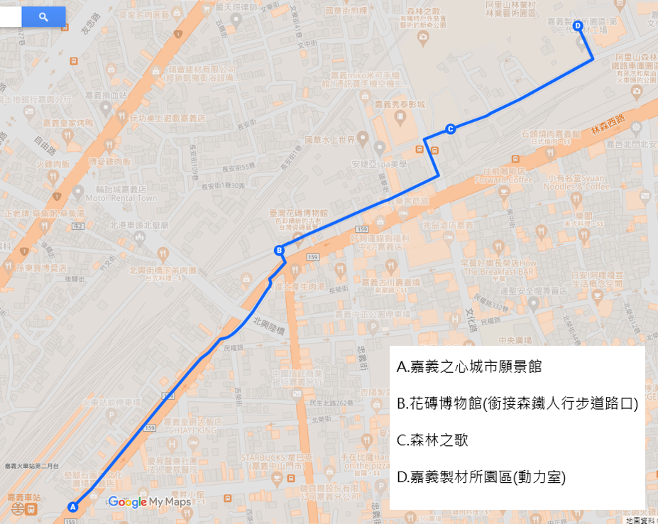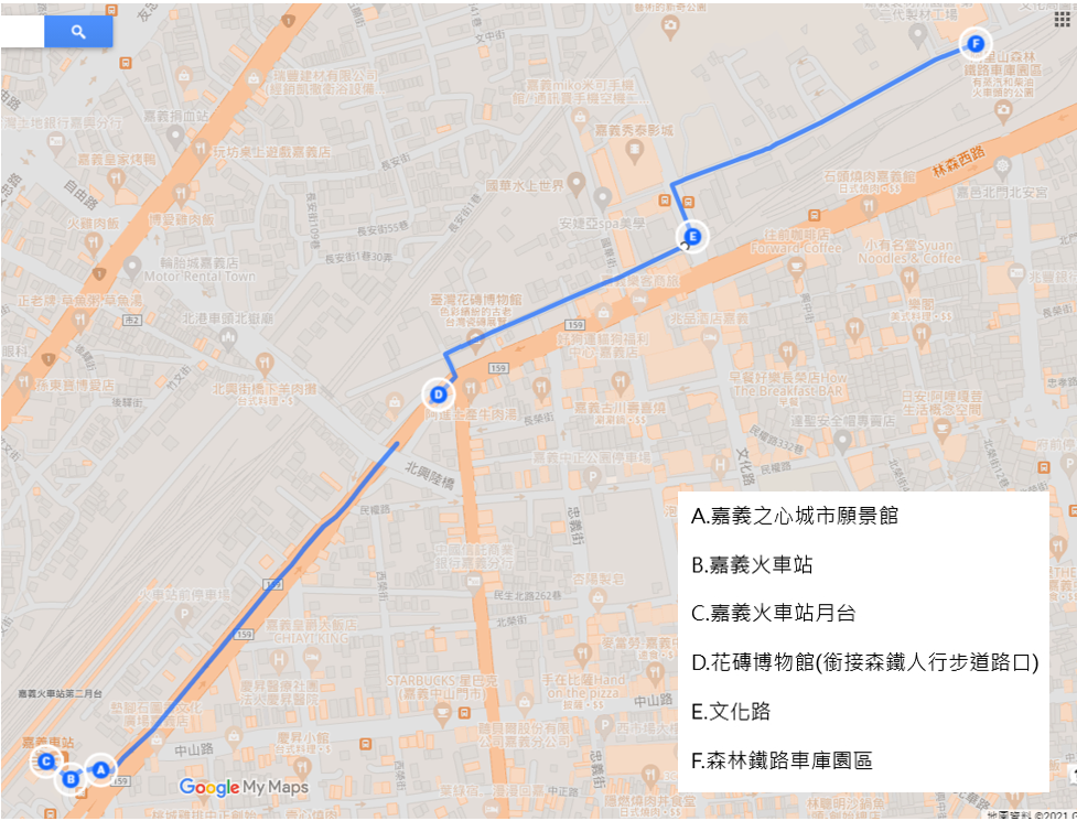 嘉義之心城市願景館【集合點】 → 嘉義車站 → 願景館後方巷弄 → 進入林森西路 → 博愛陸橋 → 花磚博物館(休憩點1) → 森鐵人行步道(鐵道地景風貌) → 卡加利美式餐廳(民間製材所工廠介紹) → 文化路 → 森林之歌 → 嘉義製材所園區(動力室) → 回程