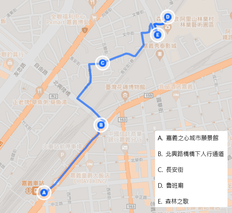 嘉義之心城市願景館【集合點】 → 北興路橋橋下人行通道 → 長安街 → 魯班廟 → 文化路 → 林鐵西側道路 → 回程