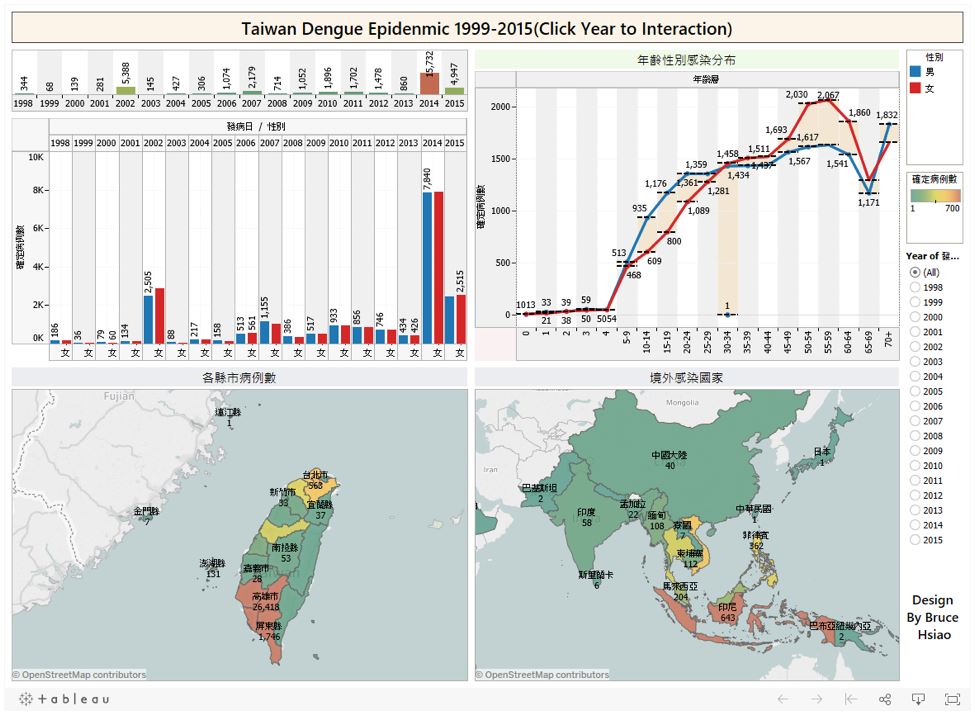 Taiwan Dengue Epidemic 1999-2015 - https://public.tableau.com/profile/bruce.hsiao#!/vizhome/TaiwanDengueEpidemic1999-2015/TaiwanDengueEpidenmic