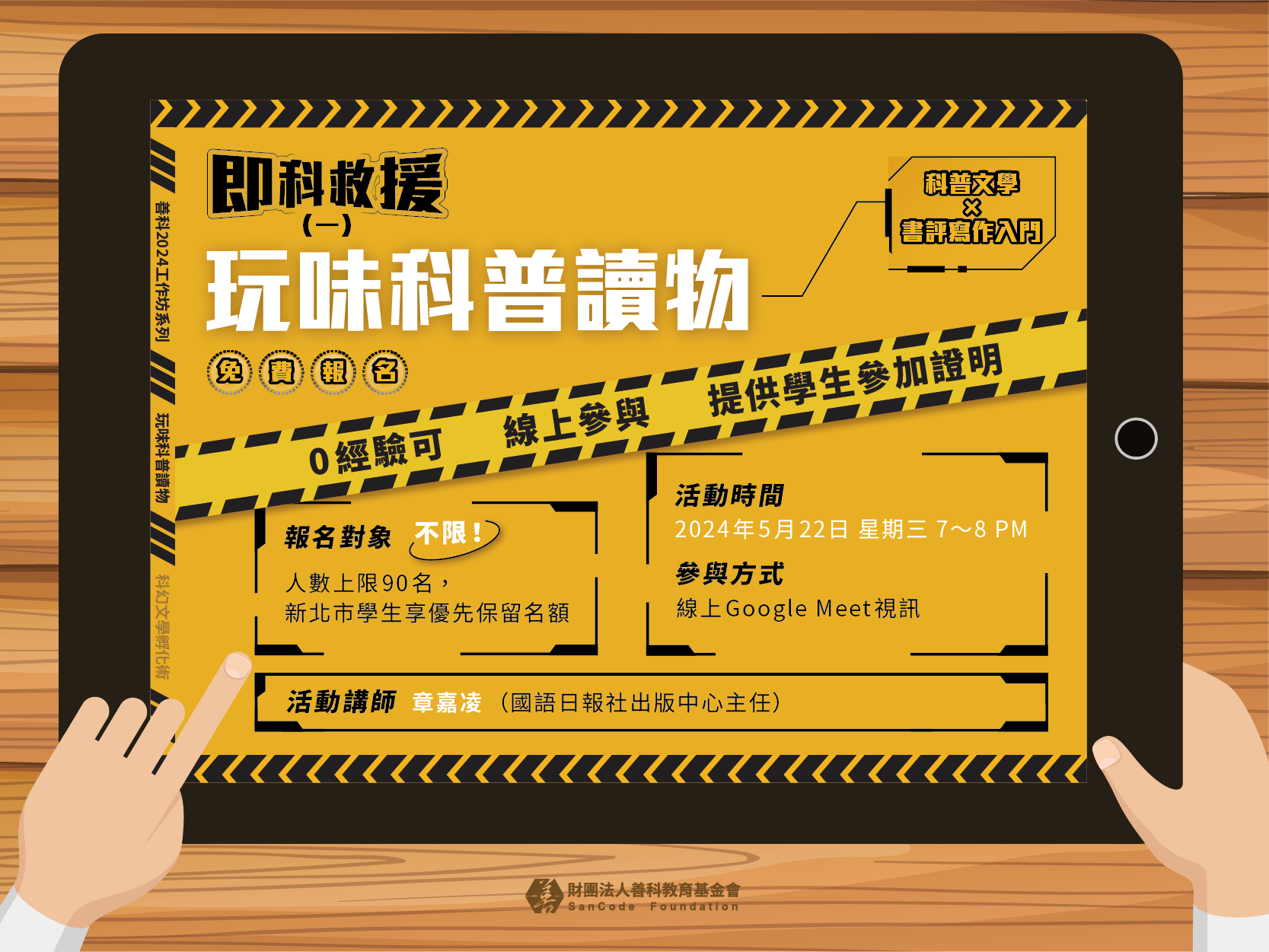 本次「即科救援(一):玩味科普讀物」活動,將邀請國語日報社出版中心的章嘉凌主任擔任講師,分享如何在咀嚼科普文學類書籍後,融合個人見解,再轉化出文字創作。歡迎有閱讀心得、書評等寫作需求者,或零寫作經驗者共襄盛舉!
