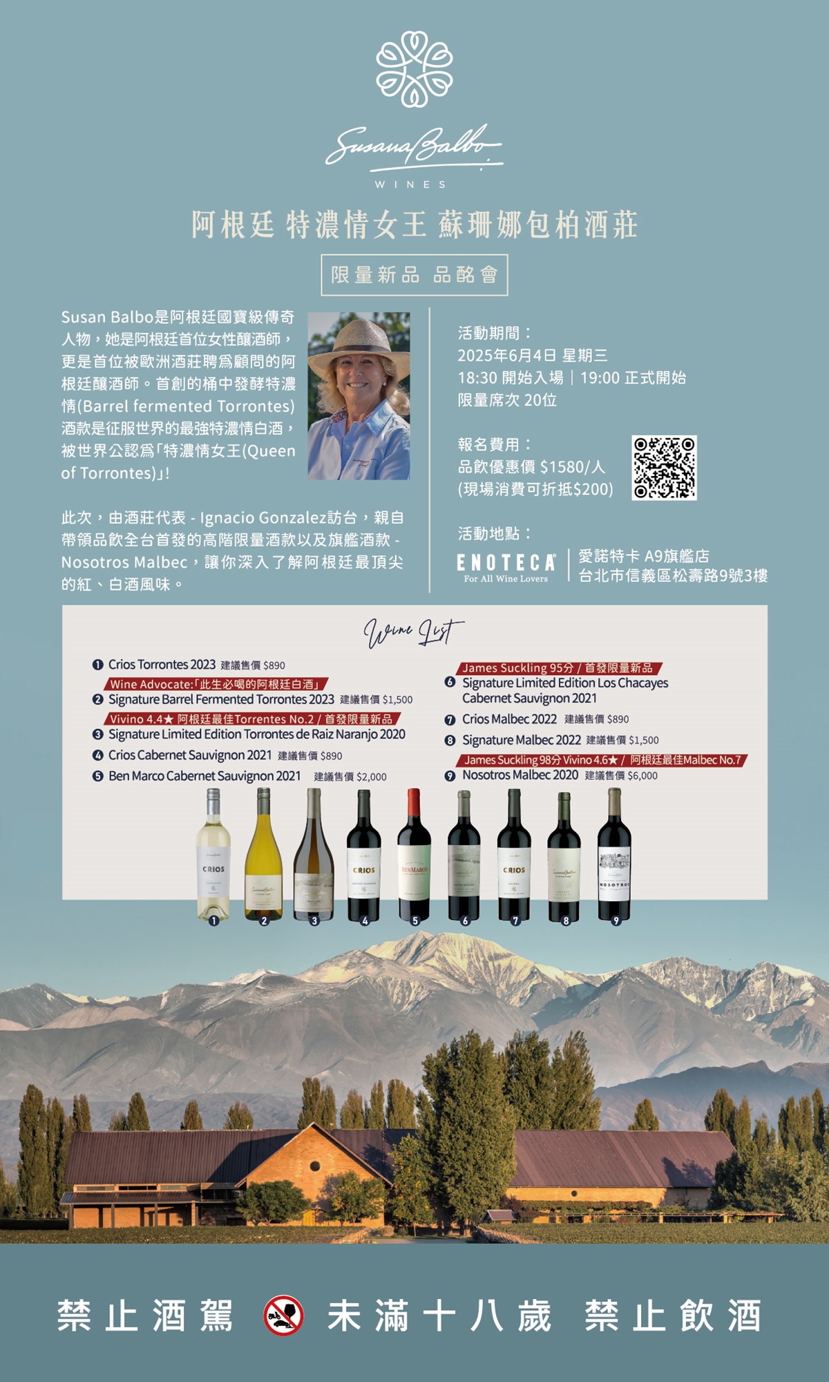 此次,由酒莊代表 - Ignacio Gonzalez訪台,親自帶領品飲全台首發的高階限量酒款以及旗艦酒款 - Nosotros Malbec,讓你深入了解阿根廷最頂尖的紅、白酒風味。