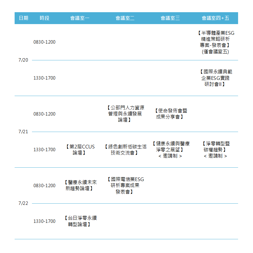 於展場二樓舉行的「亞太永續論壇」,邀請國內外引領永續行動的產官學研及民間單位,辦理11場次的論壇分場及工作坊,以深入且多元形式呈現國際永續、淨零永續、企業永續、生態永續、健康永續、醫療永續、綠色創新低碳生活、半導體產業ESG精進策略、國際電信業ESG研析與淨零轉型等趨勢分享,還有第二屆的CCUS論壇等,三天論壇場次如下所示: