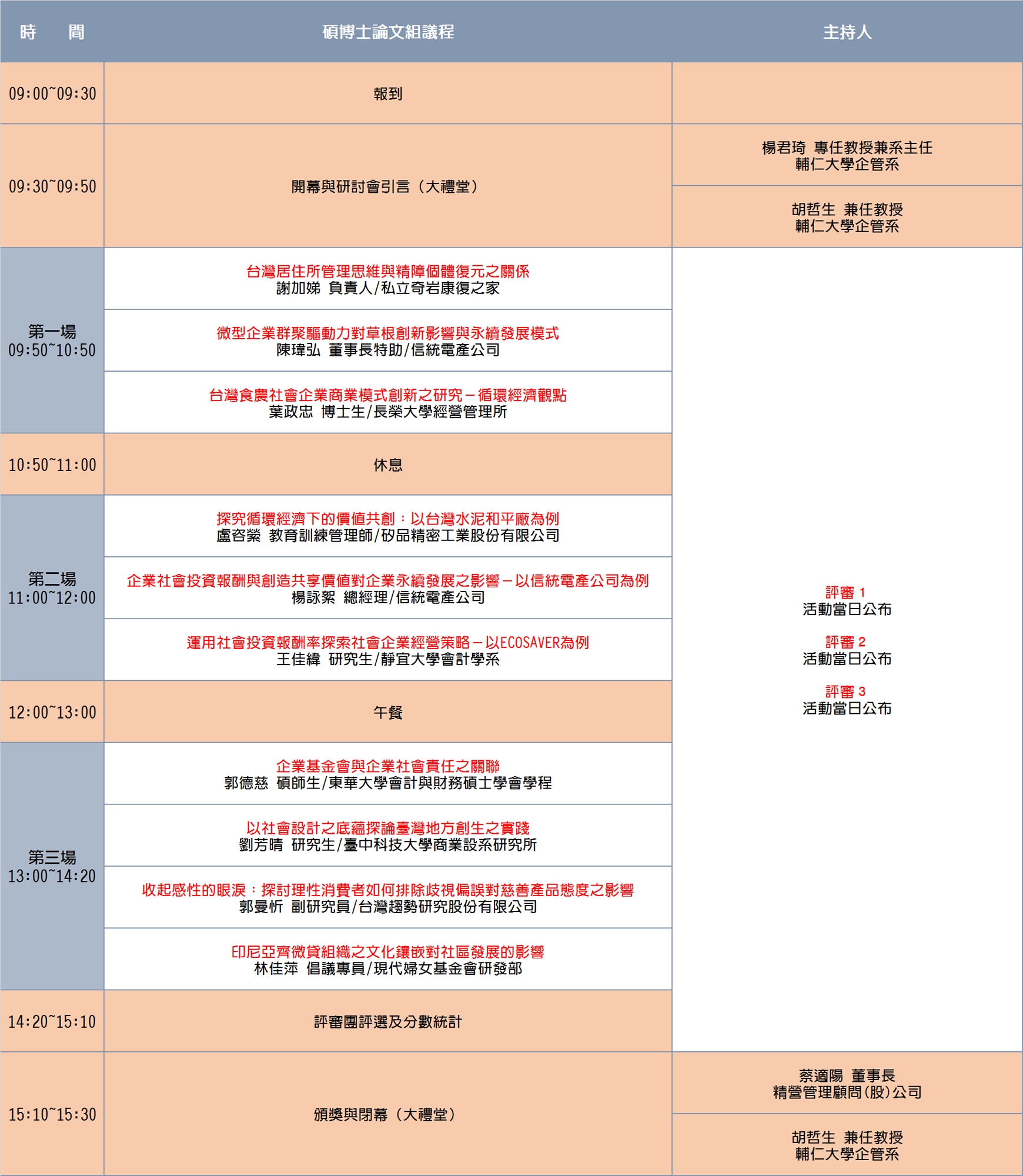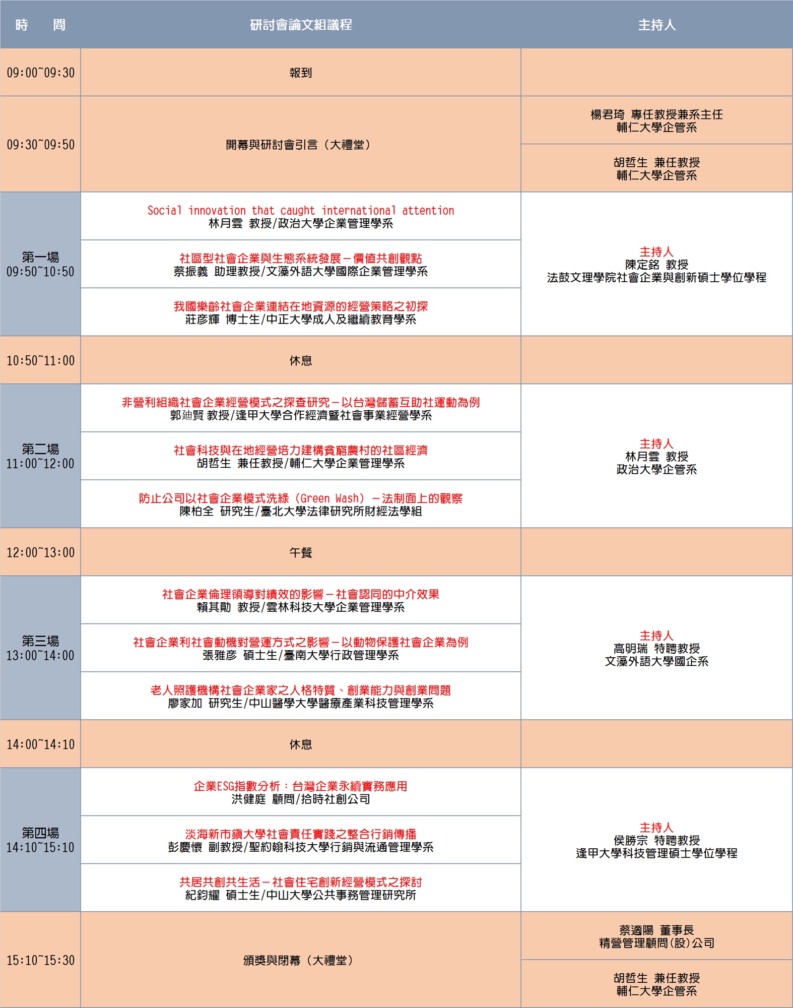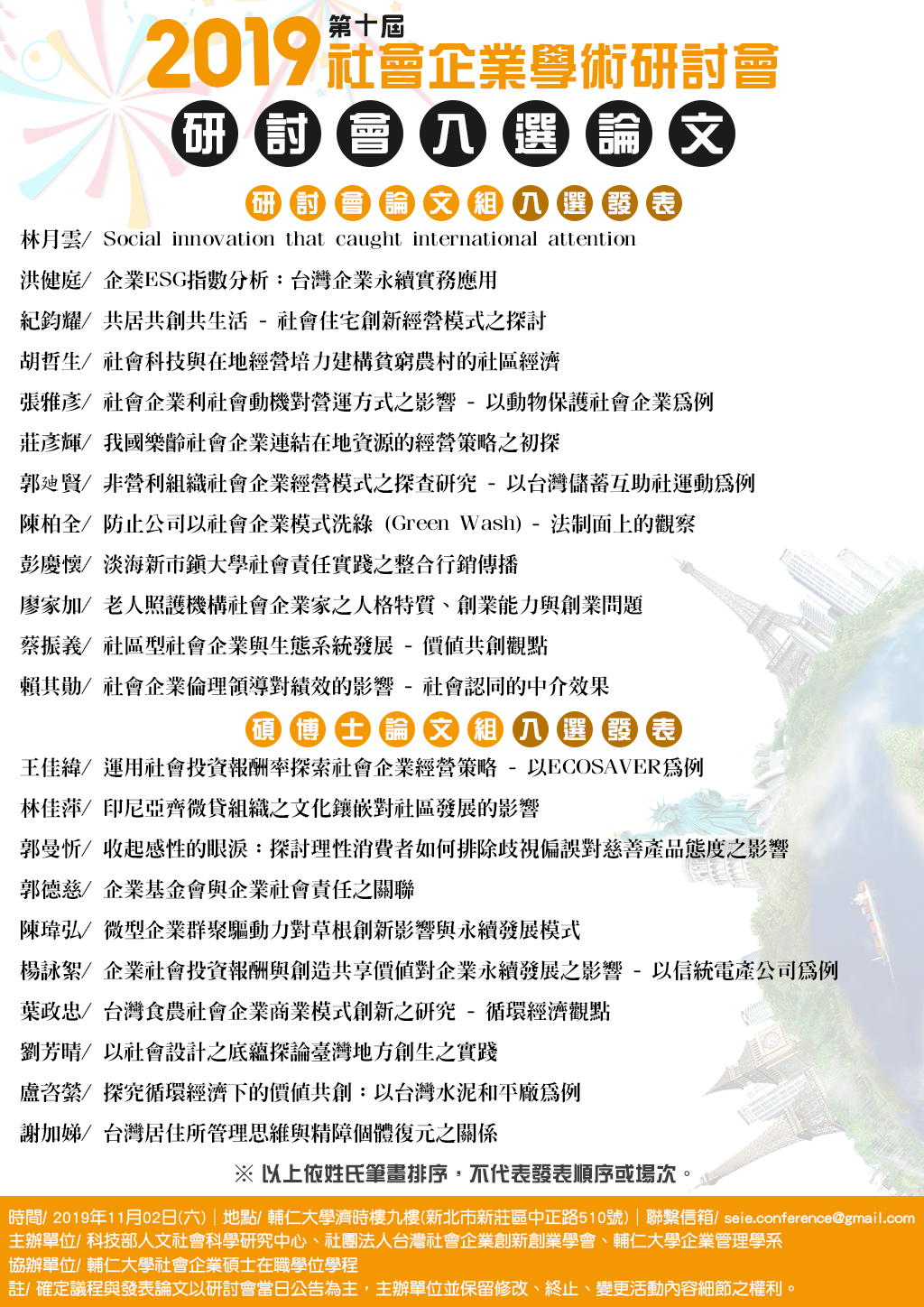 每年一次的社會企業學術研討會,對外開放報名囉!我們提供一種無形的服務,廣邀各界人士齊聚一堂,分享自己多年的研究成果,也一同探討台灣社會企業的發展走向,在這裡講者能夠宣導自身的想法並被肯定,聽眾能夠取得一些新思維與講者對話,互相碰撞與激發出新觀念,使論文研究或學術貢獻更能大大邁進與提升。