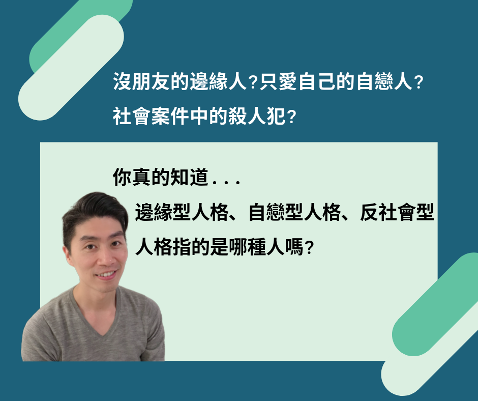 其中B型人格疾患裡的三種人格障礙:反社會型人格、邊緣型人格、自戀型人格具有高度情緒不穩定的特質,嚴重時會喪失自我察覺,影響家庭關係、人際關係,卻又普遍被社會大眾忽視。