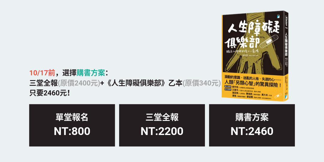 限定購書方案|10/17前,3堂課程+《人生障礙俱樂部》乙本=2460元