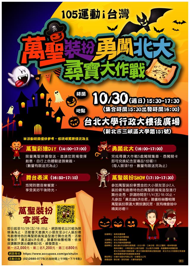萬聖裝扮報名於10/11(二)09:00起至10/28(五)18:00止,以網路報名20組為限額滿為止,邀請大小朋友至少2人於10/30(日)活動當天一起裝扮最有創意特色的萬聖節搞鬼造型進行舞台走秀,活動會後於「黃志雄&洪佳君」臉書粉絲團相簿,依據按讚數評選出優勝前3名,頒發獎金。