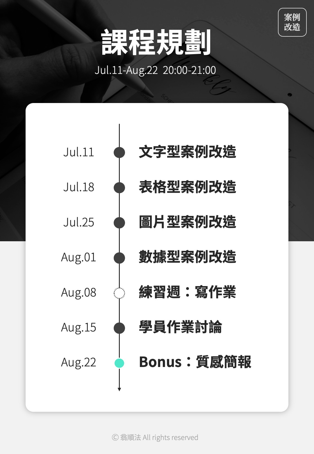 2. 時間:07/11-08/22 每週四晚上:20:00-21:00;8/8 放假 、8/22 Bonus