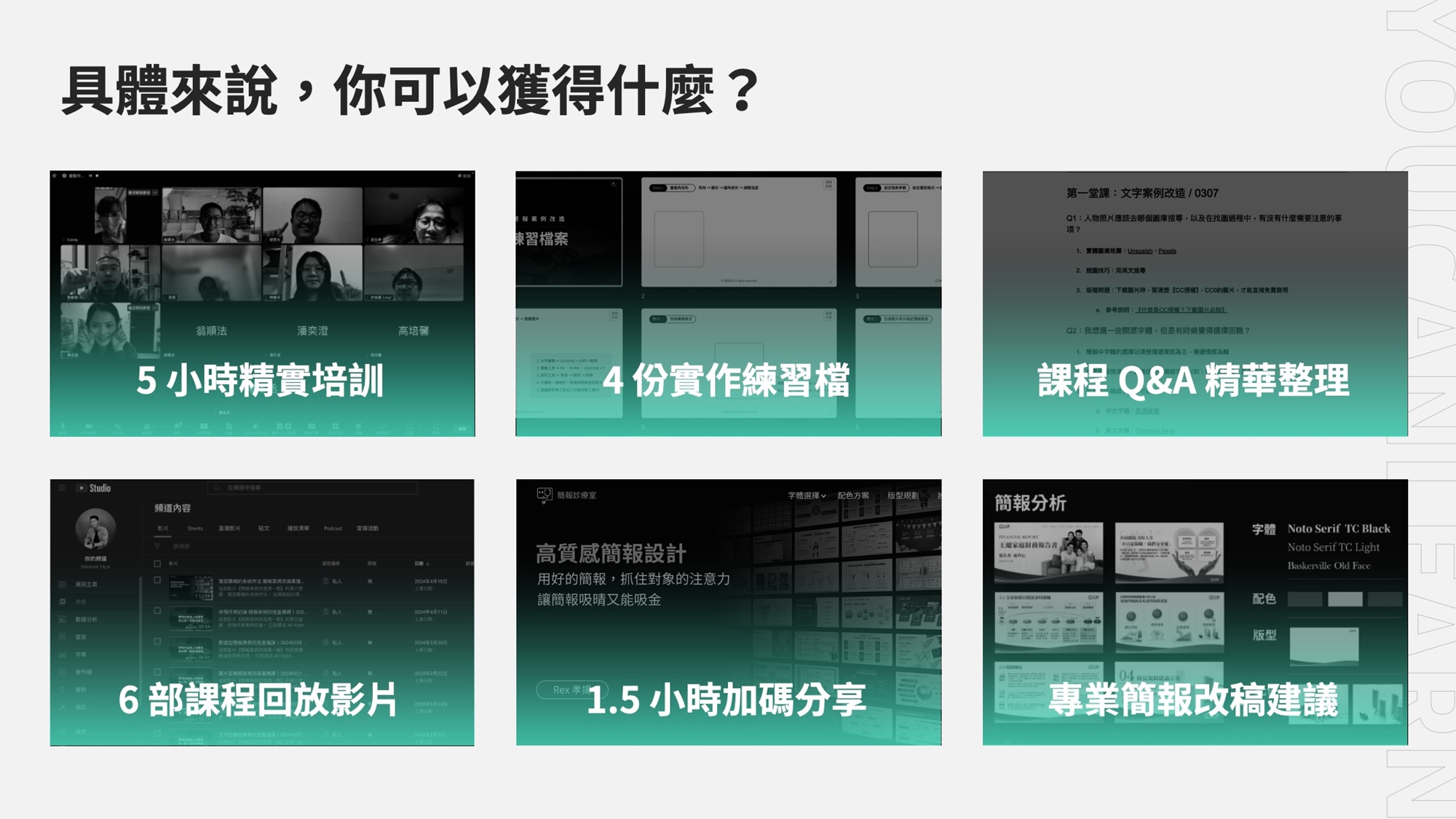 這是持續五週的簡報設計線上實戰訓練營。將透過精選設計的案例改造示範及每週作業練習,讓學員掌握文字、表格、圖片、圖表四大類的簡報設計心法與實作細節。除了五週的主要課程,還特別邀請業界的專業簡報設計師 Rex ,來分享提升簡報質感的細節。