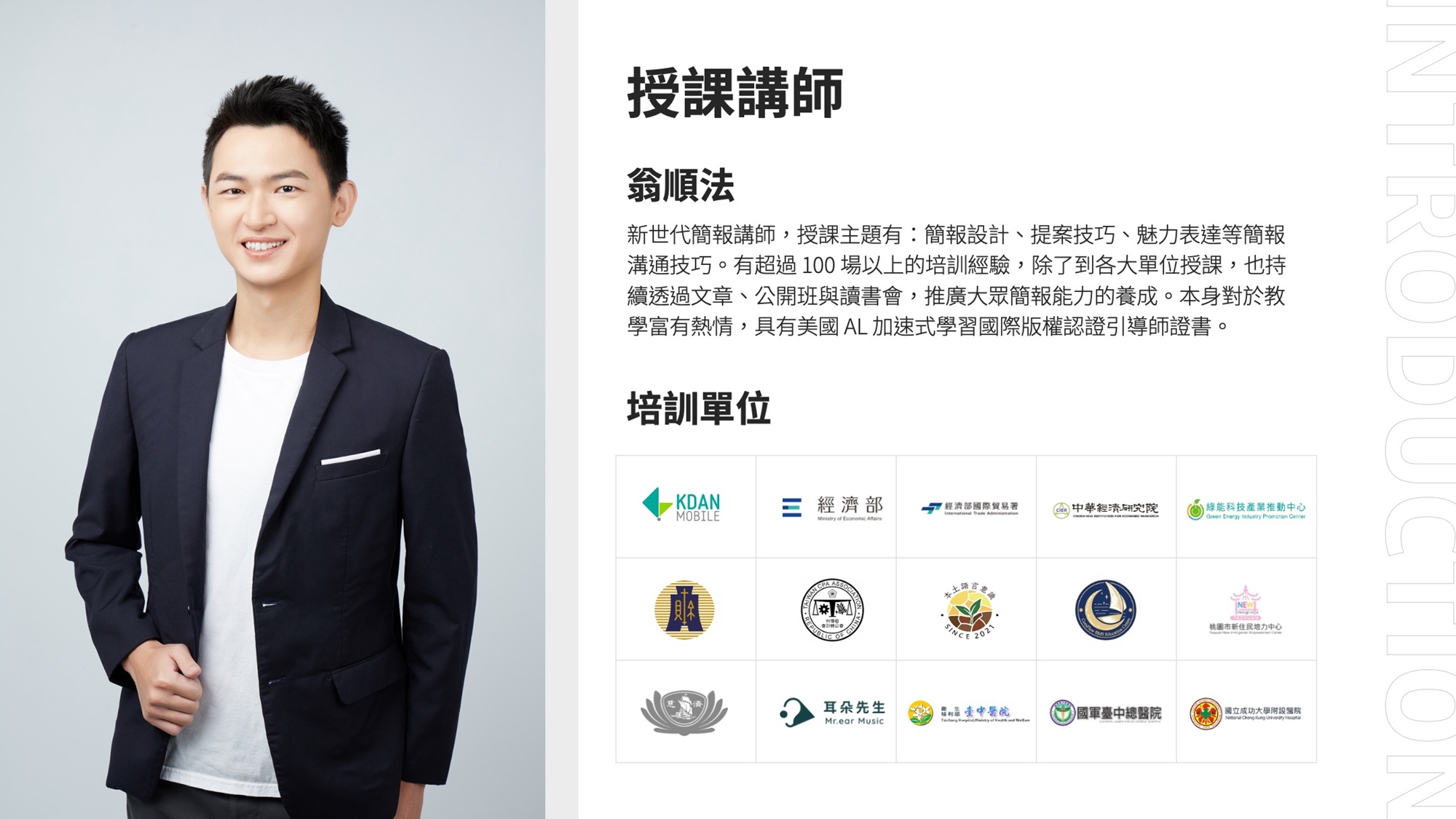 新世代簡報講師,授課主題有:簡報設計、提案技巧、魅力表達等簡報溝通技巧。有超過 100 場以上的培訓經驗,除了到各大單位授課,也持續透過文章、公開班與讀書會,推廣大眾簡報能力的養成。本身對於教學富有熱情,具有美國 AL 加速式學習國際版權認證引導師證書。
