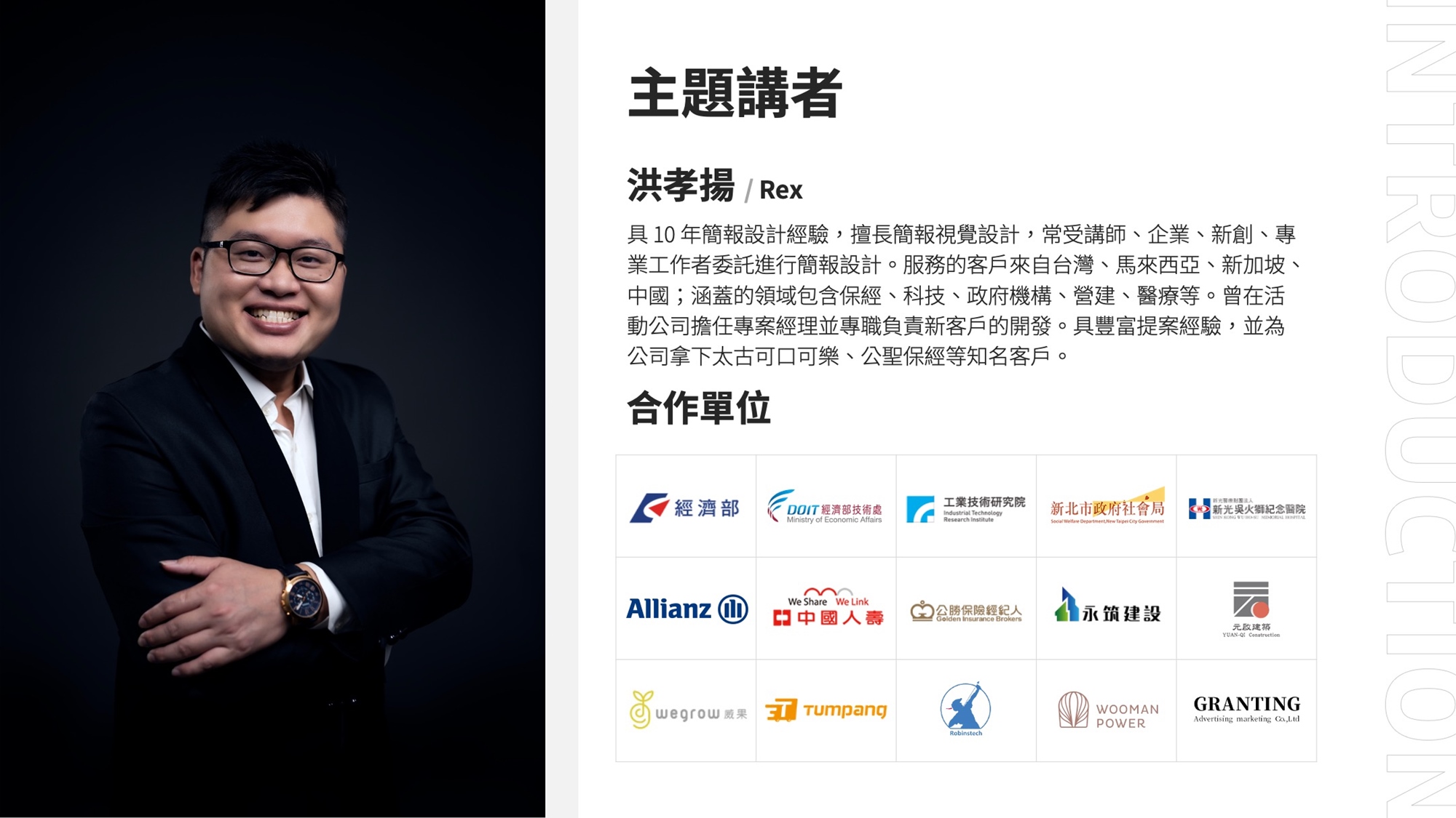 具 10 年簡報設計經驗,擅長簡報視覺設計,常受講師、企業、新創、專業工作者委託進行簡報設計。服務的客戶來自台灣、馬來西亞、新加坡、中國;涵蓋的領域包含保經、科技、政府機構、營建、醫療等。曾在活動公司擔任專案經理並專職負責新客戶的開發。具豐富提案經驗,並為公司拿下太古可口可樂、公聖保經等知名客戶。