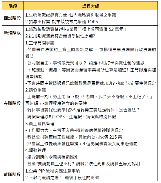 - 以「勞動生命週期」作為學習框架:帶學員依序認識各階段實務管理上之法律規範與常見爭議,避免誤觸法網。