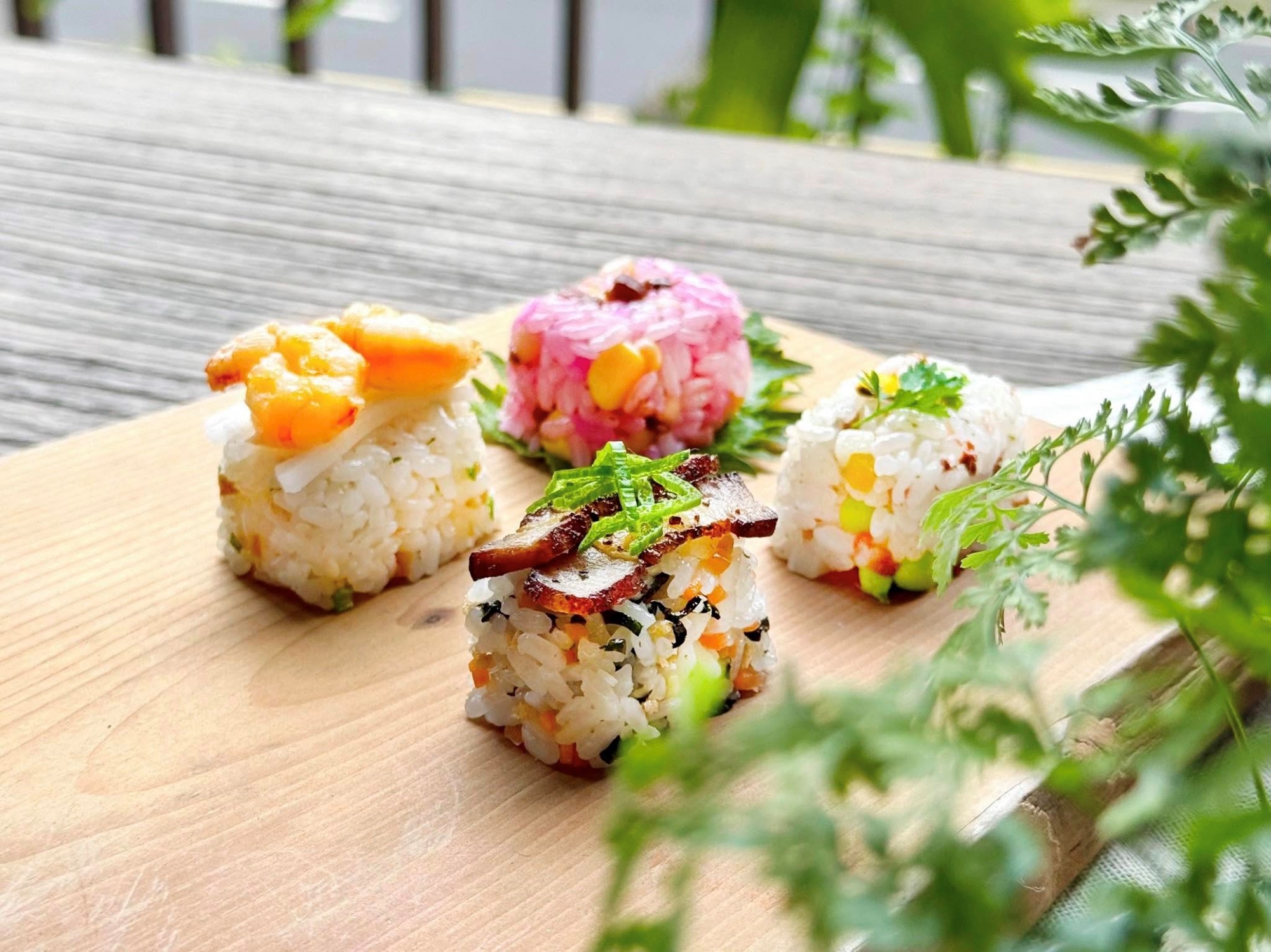 3.每人手捏4顆、2種不同口味的飯糰 (紫蘇漬梅蘋果、火燒蝦仁蘿蔔兩種風味)