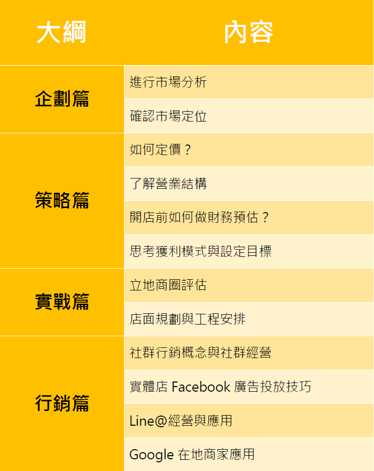 本次課程,邀請到台灣第一間素食早餐連鎖店「得來素」創辦人關登元,以他創業十年,從一台小餐車發展到全台16家素食早餐連鎖店的親身經驗,帶你從創業前的點子企劃、準備中的店面選擇、開店後的營運計畫,一直到提升店面營收的數位行銷策略,全盤認識開店的標準攻略,你將學會用最少資源做最好的規劃,一開張就立於不敗之地!