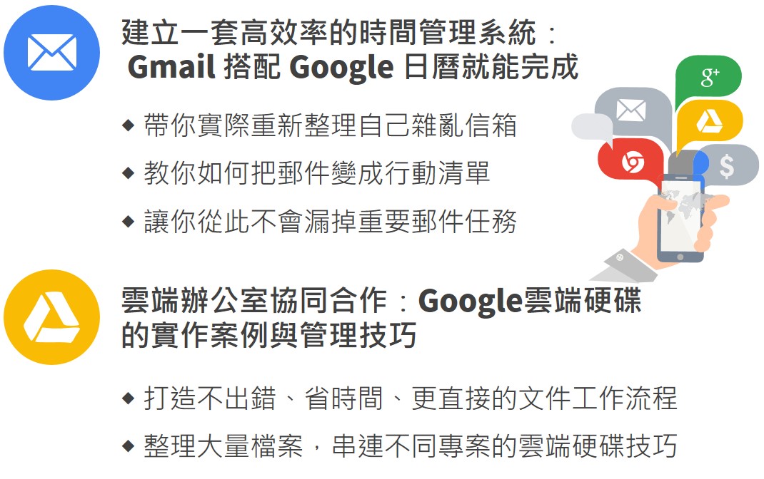 面對職場上每天不停產生的新任務、冗長且零散的會議與行程、繁瑣的信件往來、大量且重複的溝通過程、資訊傳達不夠即時等,當你沒有好好管理這些事務,就會大幅拖垮了你的工作的效率。這時,你更應該學會Google雲端工作術!