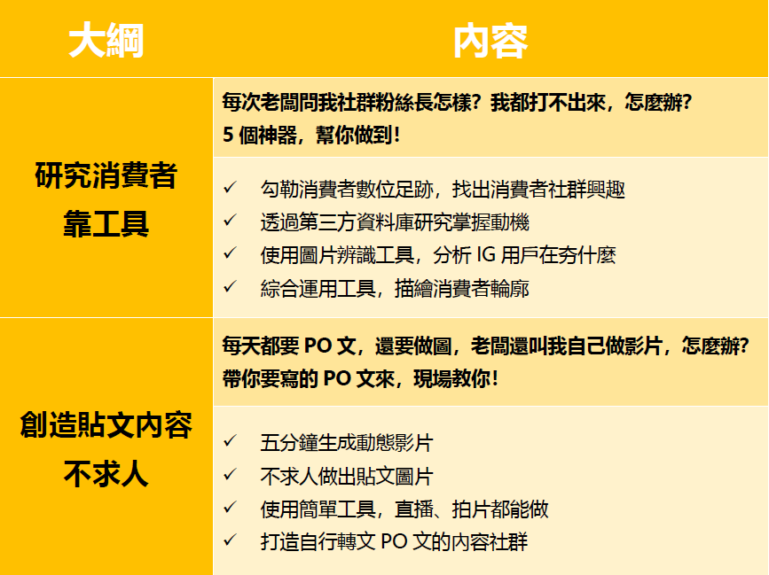 本次課程,邀請到前奧美社群團隊副總CJ(王俊人),前來分享他投入數百個小時,研究國內外各項社群行銷工具後找到小編神器系列,不僅能用來分析消費者、做圖、做影片,還能辨識IG圖文,透過關鍵字自動轉文,讓你從此學會如何以科技取代人力,不僅效率提升,專業度也會一起飆升!