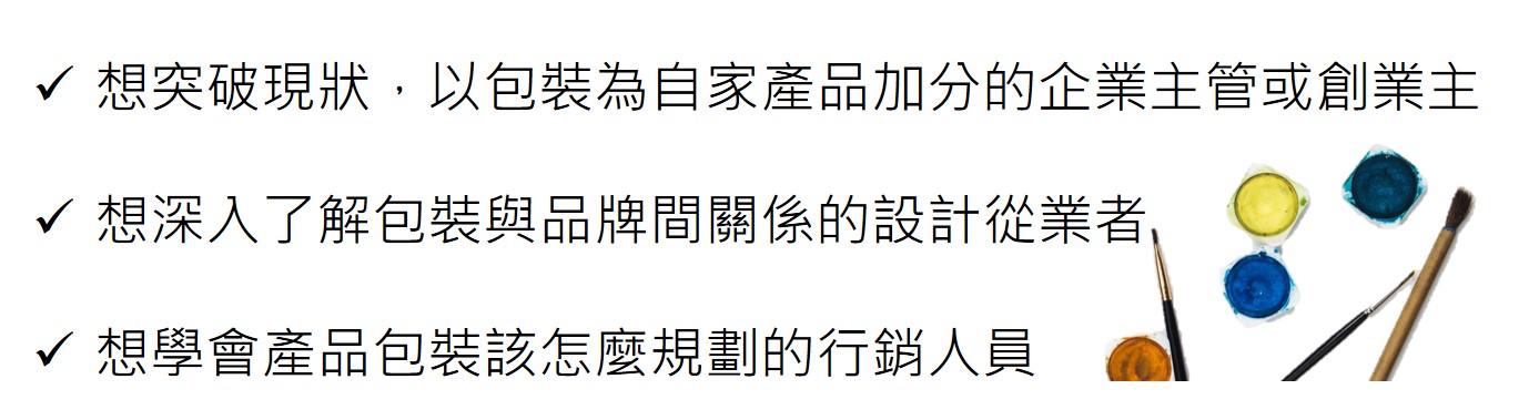 這次的課程,邀請到麥傑廣告總監/中華平面設計協會榮譽理事長 陳進東老師,以理論與實務案例,由淺入深,帶你學會如何藉由品牌行銷與包裝美學,產生一個符合品牌策略定位與感動人心的包裝設計戰略!教你以品牌換位思考法,看見消費者內心的需求!以市場洞察力、設計情感力,打造獨特包裝視覺,從內而外建構品牌戰略,讓商品更具滲透力、創造品牌影響力!